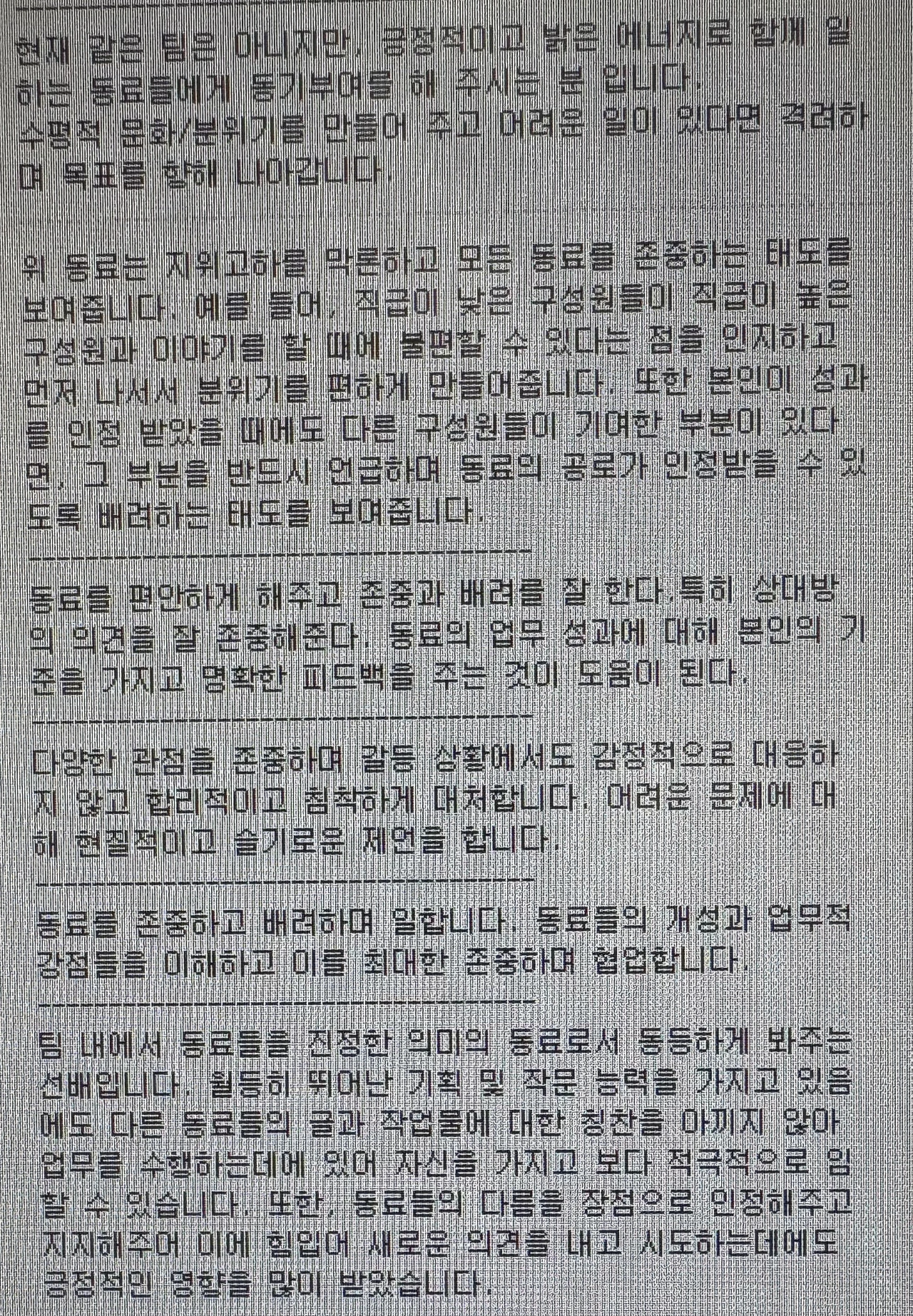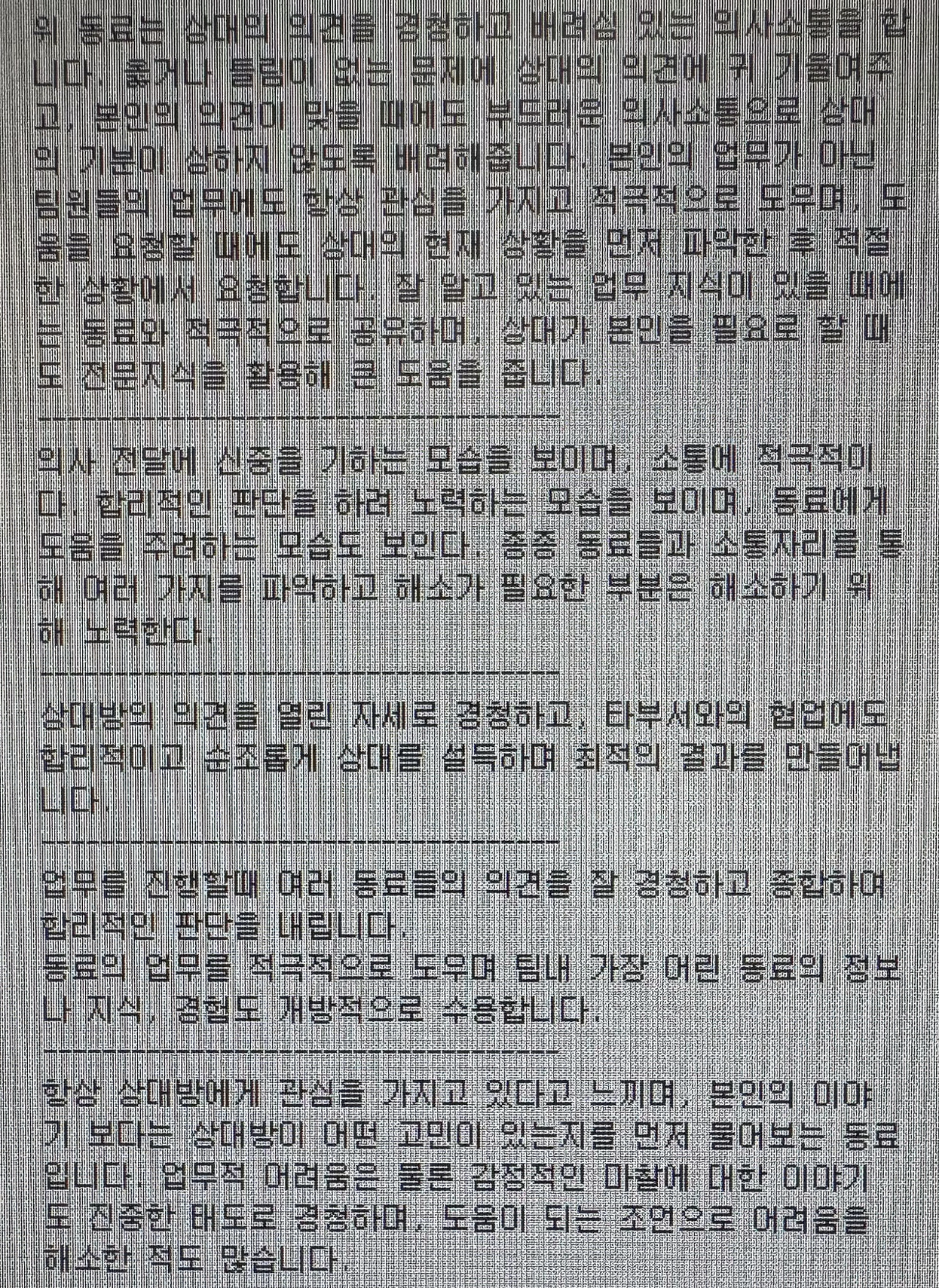일은 하기 싫어 죽겠지만 나도 모르게 보고서의 오탈자를 검수하며 불릿이 층위에 맞게 잘 들어갔는지 고민한다. 어떤 일에서는 효율을 좀 더 고민하고, 어떤 일에서는 동료의 딥빡에 대해 마음 쓰며, 또 어떤 일에서는 완성도에 집착하기도 한다.