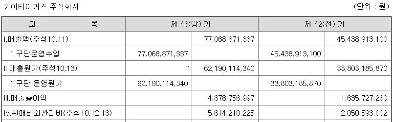 영업이익 기준으로 7억 원이 넘는 적자. 그나마 인기구단에 속하는 기아 타이거즈가 이 정도이니, 국내 프로스포츠에서 모기업에 의존하지 않고 자생적으로 돈을 버는 프로스포츠 구단은 거의 없다고 봐야 한다.