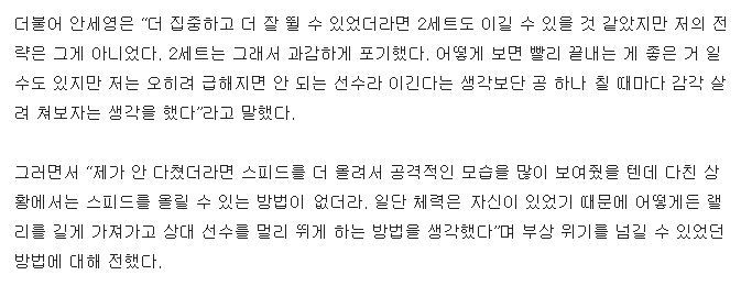 경기 후, 그녀의 인터뷰를 보고 범인(凡人)의 생각을 뛰어넘은 전략에 감탄을 금치 못했다.