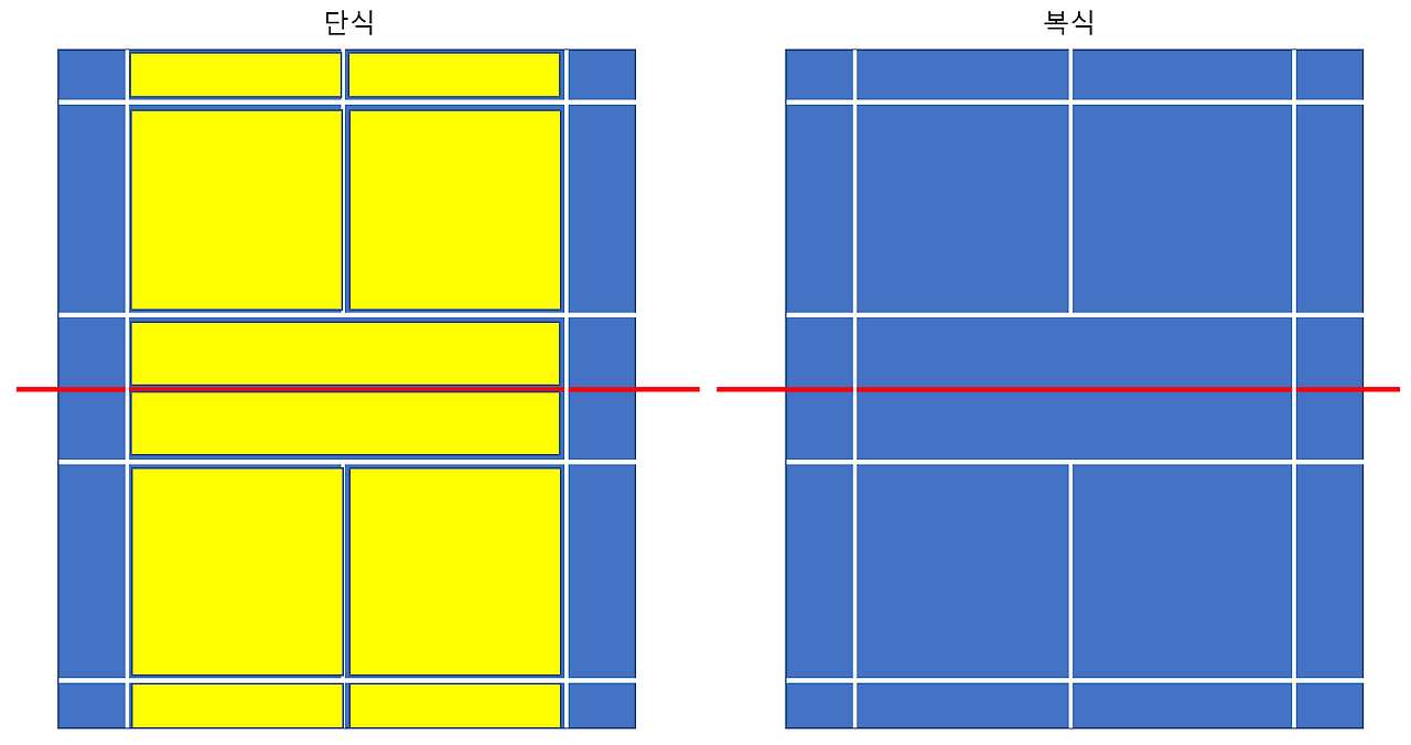배드민턴은 단식과 복식 모두 같은 크기의 코트를 활용하지만, 커버리지는 다르다. 모든 영역을 IN 영역으로 포함하는 복식 코트에 비해, 단식 코트는 위 그림처럼 옆면의 일부(파란색 표시)를 OUT 영역으로 제외한다. 그렇다 하더라도 선수 1명이 쓰는 면적은 비교불가다. 따라서 복식선수들은 공을 앞뒤로 보내면서 빠른 템포로 체력을 소진시키지만 단식선수들은 앞뒤에 좌우까지 활용해 더욱 큰 폭의 체력을 소진시키며 경기에 임한다.
