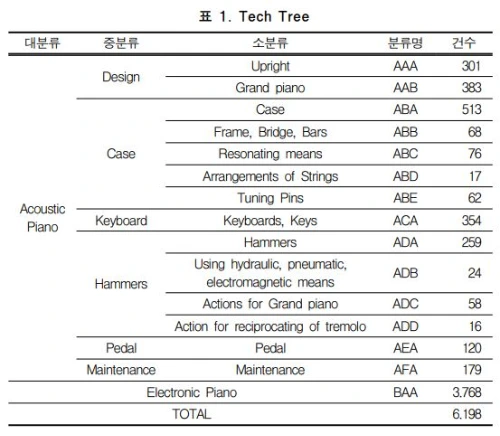 [인용] 어쿠스틱 피아노의 기술 동향을 파악하기 위해 통합 특허 데이터베이스인 톰슨 이노베이션을 활용하여 1995년부터 2015년까지 출원된 어쿠스틱 피아노 관련 특허를 분석하였다. 분석 결과, 어쿠스틱 피아노에 대한 특허 출원은 1995년에 가장 활발하였으나 이후 점차 감소하는 추세였으며, 주요 국가 중 일본의 특허 출원 비율이 가장 높았으나 1996년 이후 감소하는 추세인 반면 한국과 미국의 특허 출원은 증가하는 추세였다. 기술 성장 단계 분석론을 통하여 어쿠스틱 피아노 기술을 세분화하여 각 특허들을 검토한 결과, 디자인 관련 기술과 케이스 기술의 비율이 가장 높았으나 감소 추세인 반면, 건반 기술 및 해머 기술에 대한 특허 출원은 증가하는 추세였다.