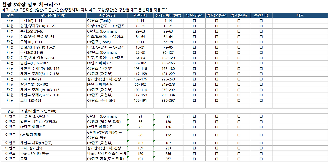 제가 만들어드린 367마디 색상 구분 엑셀은 암보에 생각보다 큰 도움이 됩니다. “지금 연주하는 패턴이 제시부인지 발전부인지",“원본 몇 마디인지”, “여기가 반복된 패턴인지 새로운 패턴인지” 이걸 눈으로 확인하면서 연습하면 구조적 기억(Structural Memory)이 강해져서 암보가 오래갑니다.