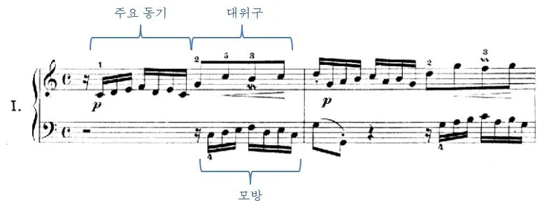 단순히 연습 교재로써의 역할뿐만 아니라 작곡에 대한 기초를 쌓을 수 있는 기본이 깔려 있다는 뜻이다. 그리고 교재라고 칭하기 전에 하나의 의미 있는 작품이 아닐 수 없다. 내가 처음 인벤션 1번 BWV 772를 연습할 때 이런 배경을 잘 알지 못했고 단지 바흐라는 대 작곡가를 좀 더 공부하기 위해서였다고 해야 할 것이다. 그런 학구열도 가진 피아노 초보생이다. 인벤션 연습은 좌우 선율의 배열이 굉장히 생소하고 뭐 이런 곡이 다 있나 싶을 정도로 당황스러웠다. 그 당황스러움은 통상 왼손은 반주를 오른손은 선율을 이끄는 그간 연습해 왔던 곡들과 달리 유사한 선율이 왼손과 오른손이 번갈아 가면서 등장함으로써 서로 역할이 다르지 않다는 것을 체감하면서 느끼는 모호함과 신선함이었다. 이런 이유로 체르니 연습곡을 비롯하여 대중적인 피아노곡보다 악보의 생김새는 훨씬 간편해 보여도 연주는 전혀 그렇지 않다는 걸 알게 된다. C major 인벤션 1번의 단선율은 맑은 하늘 하얀 구름과 산들바람이 흐르는 들판에 서 있는 듯한 기분으로 시작된다. 오른손에서 시작한 선율은 이내 동일한 모양새로 왼손으로 옮겨가 반복되면서 전체 선율은 끊김 없이 이어진다. 그런데 어라? 이 양손 엇갈려 쫓아가는 달달한 맛은 뭐지? 라며 연습은 호기심과 흥미로움이 교차한다. 바로 <대위법>이라는 악식을 체험 접했을 때의 나의 첫 감동이었다. 대위법이라는 구구절절한 이론적인 얘기부터 시작했다면 이런 감동은 어림도 없었을지도 모르겠다. 대위법이 무엇인지, 모티브, 대위 구, 모방.. 이런 용어들이 무엇인지도 전혀 알지 못했던 상태에서 손과 귀는 그간 흔하게 들어왔던 - 주로 낭만파 음악들 - 과의 차이와 그 이전 시대의 때 묻지 않은 순수한 감상을 전해주었다. 화려한 디지털시계를 보다가 어느 날 서랍장 속에서 색 바랜, 하지만 깊은 의미가 묻어있는 아날로그시계를 발견한 기분이라고 표현하고 싶다. 대위법 관련하여 위 용어들 외에 최소한의 몇 가지는 알고 있어야 관련 음악이나 지식을 검색할 때 유용하다. 아 그 거시기 뭐냐... 이럴 순 없다. 이름이라는 게 불릴 때 우리는 서로 대화를 시작할 수 있으니까. 물론 이름 좀 안다하여 어디서 아는 체도 할 수는 없다. 바흐의 음악은 그 깊이를 가늠하기 힘든 학문으로서 한 영역을 영위하고 있기 때문이다.