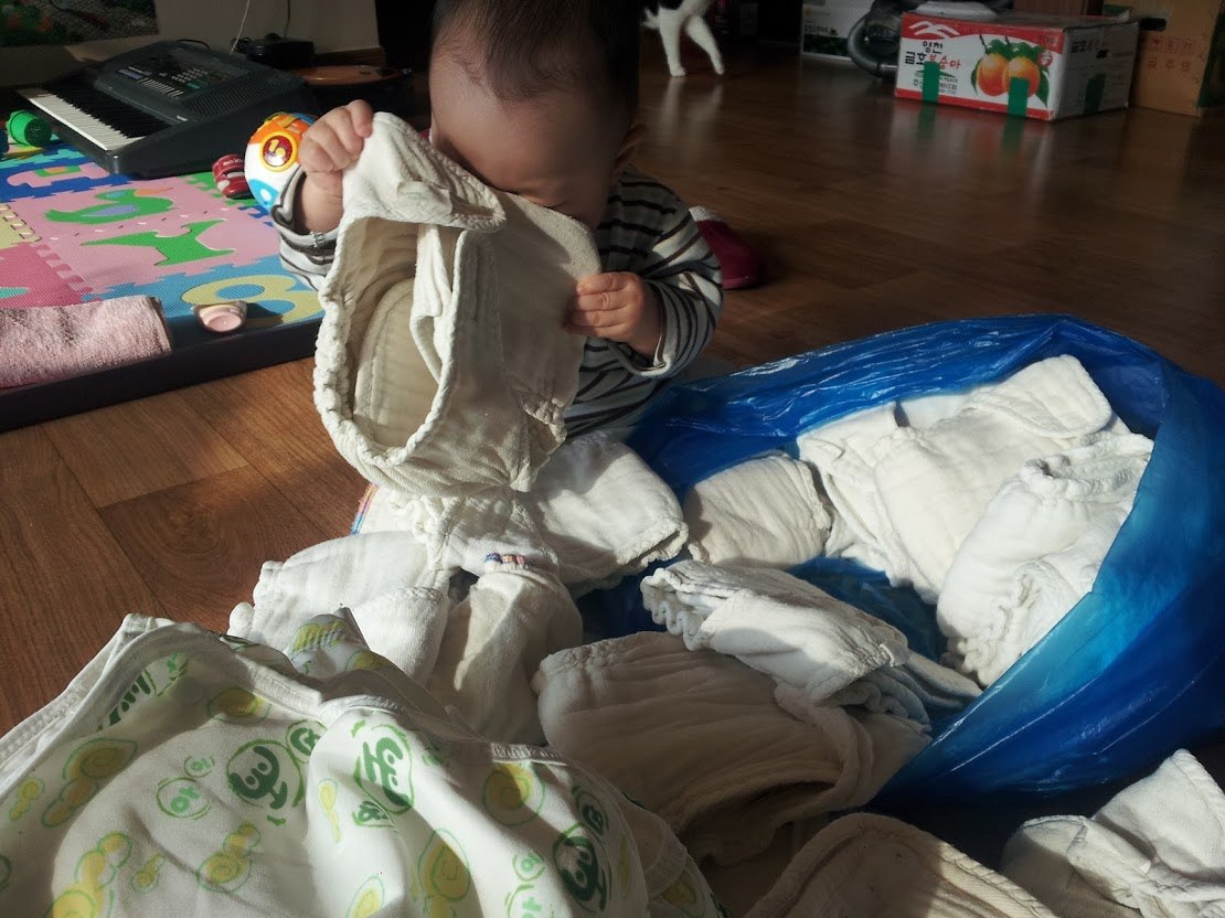 그렇게 첫 시작은 큰 돈을 들이지 않고 중고로 접어쓰는 소창기저귀를 잔뜩 사고 남들이 버리다시피하는 오래된 커버 몇 개를 얻어다 밤마다 남편과 수작업으로 하나하나 접어가며 사용했다.