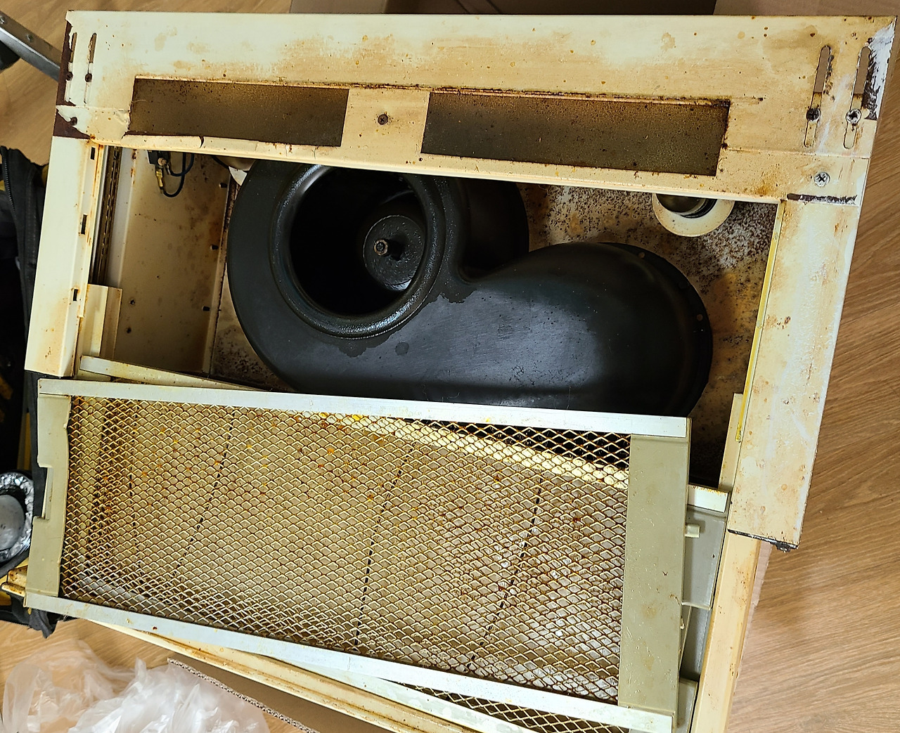 베테랑이 마침내 떼어내 바닥에 내려둔 낡은 후드. 만약 켰다면 삼겹살 기름과 함께 고기를 노랗게 익혔을 역사의 기름으로 뒤덮힌 모습.. 더 놀라울 일이 또 있을까 했는데 언제나 우리의 아파저씨는 실망시키는 법 없다.