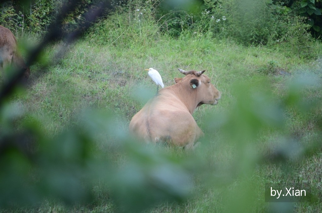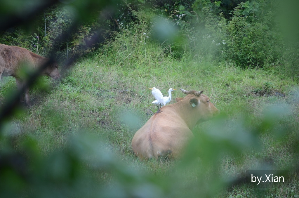 백로가 소 등위에서 사뿐사뿐 걸으며