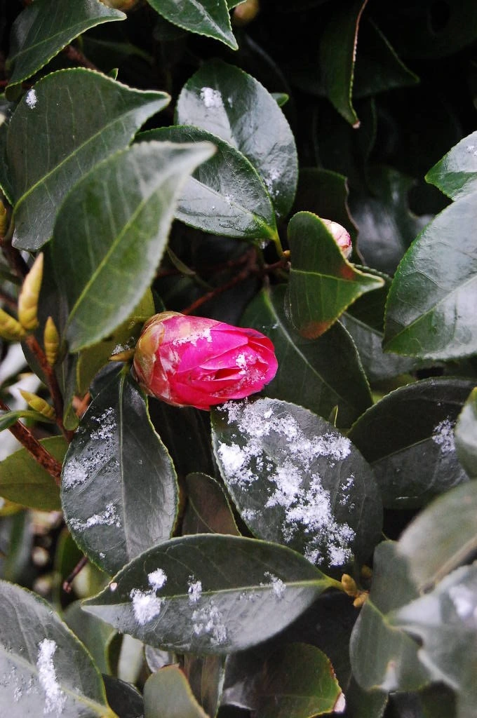 꽃이 매달린 동백나무에는