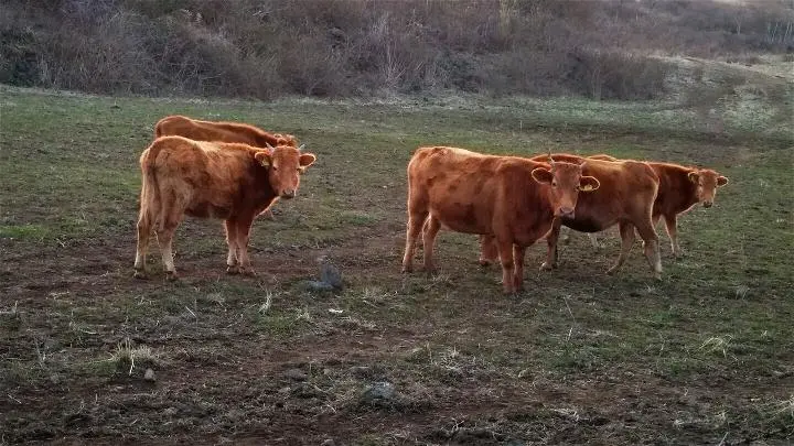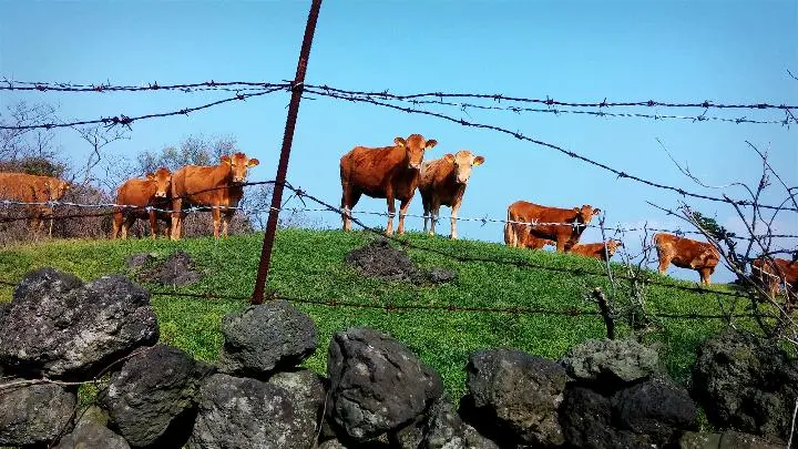 소들이 언덕바지 위에서 풀을 뜯고 있었다.