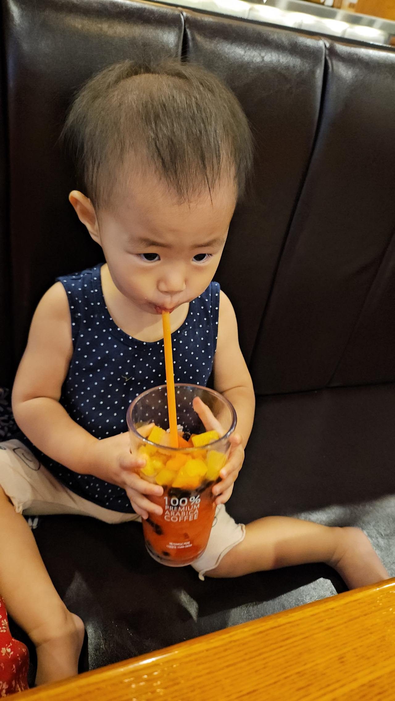 카페에 가면 아이랑 같이 먹을 요량으로 과일주스 종류를 사서 먹었는데(원래는 커피를 시켰는데 내 커피를 뺏어먹는 걸 보고는 과일주스로 바꿨다) 이게 아기 입에 너무 달고 맛있었나보다.