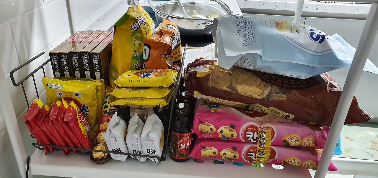김가장네의 팬트리는 총 3곳으로 나뉘어있는데 여기는 그중 과자 팬트리. 뒤에 냄비는 눈여겨보지 말길 바란다