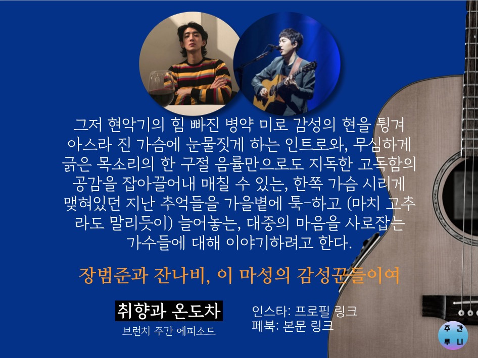 하지만 이런 예외적인 사항은 차치하고, 그저 현악기의 힘 빠진 병약미로 감성의 현을 튕겨 아스라진 가슴을 눈물짓게 하는 인트로와, 무심하게 긁은 목소리의 한 구절 음률만으로도 지독한 고독함의 공감을 잡아끌어내 냅다 매쳐 한쪽 가슴 시리게 맺혀있던 지난 추억들을 가을볕에 툭-하고 (마치 고추라도 말리듯이) 늘어놓는, 대중의 마음을 사로잡는 가수들에 대해 이야기하려고 한다. 그것도 이 시대에 드물게 롱런 중인 두 남자가수, 장범준과 잔나비에 대해서 말이다.