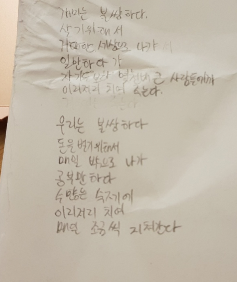 작가를 꿈꾸거나 책, 콘텐츠를 읽고 보는걸 즐기며 이미 글을 쓰고 있는 아이들이라 그런지 대부분의 아이들은 중2가 썼다고 보기엔 예상보다 수준이 높은 글을 썼다. 어떤 글은 귀여웠고 어떤 글은 공감가며 가슴 아프기도 했고 또 어떤 글은 기성작가의 글마냥 깜짝 놀랄만큼 뛰어난 감성으로 짧은 시간동안 저마다의 표현 능력을 뽐냈다.
