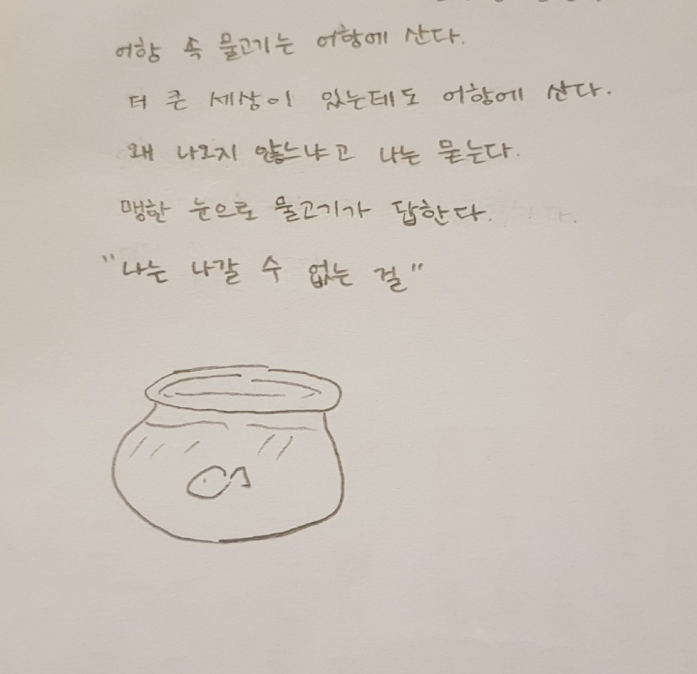 나의 생각: 인간이 가둔 물고기. 그들의 생각은 알 수 없는 법. 하지만 그런 평범한 것에서 깨달음을 얻은 아이. 세상 밖으로, 더 큰 강으로, 바다로 나가고 싶어도 나갈 수 없는 물고기의 신세 한탄을 통해 우물 안의 개구리인 자신, 학생들, 인간들의 현실과 이상을 대변하며 우회적으로 풍자하는 솜씨가 탁월하다.