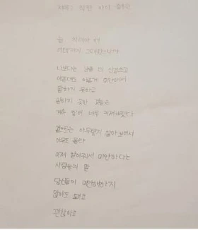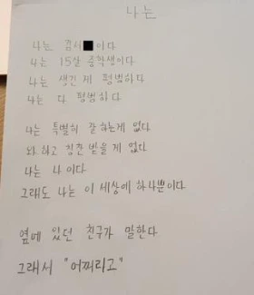 나의 생각: 배려심 깊은 아이. 이타심 때문에 자기 자신보다는 항상 남을 먼저 생각하며 살아왔을 어린 15살의 인생을 생각하니 가슴 아프다. 그리고 그렇게 쌓인 상처와 아픔들은 산보다도 더 커졌지만 이제사 그걸 알아봐주는 사람들에게마저 미안해하지 말라는, 괜찮다는 한마디가 가슴을 후벼파고든다. 중학교 2학년 아이에게도 이런 넓은 아량과 이해심이 있다. 애어른이라고? 아니, 이 아이의 성품은 이미 그 누구보다 '어른'이다.
