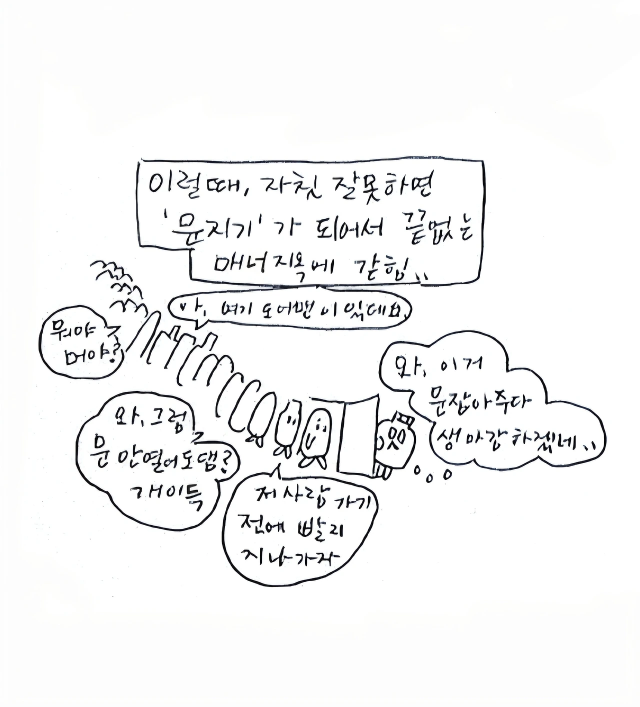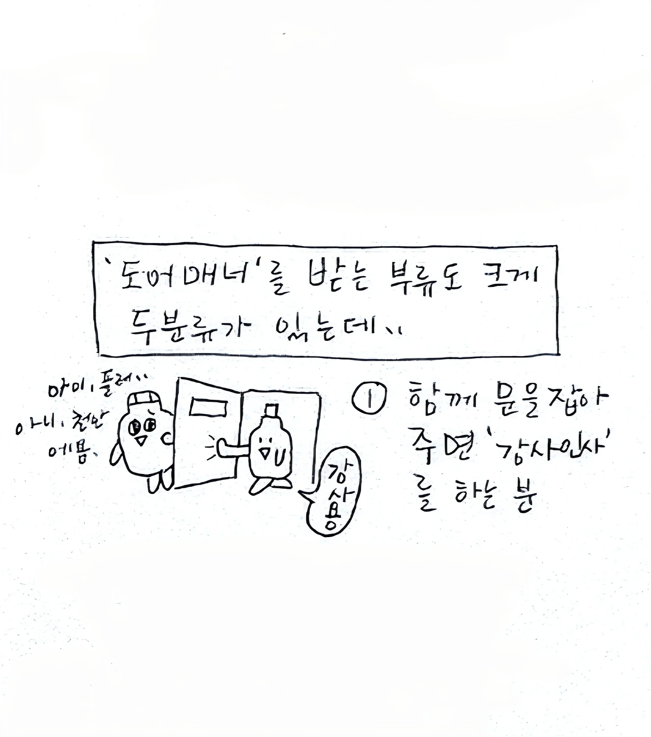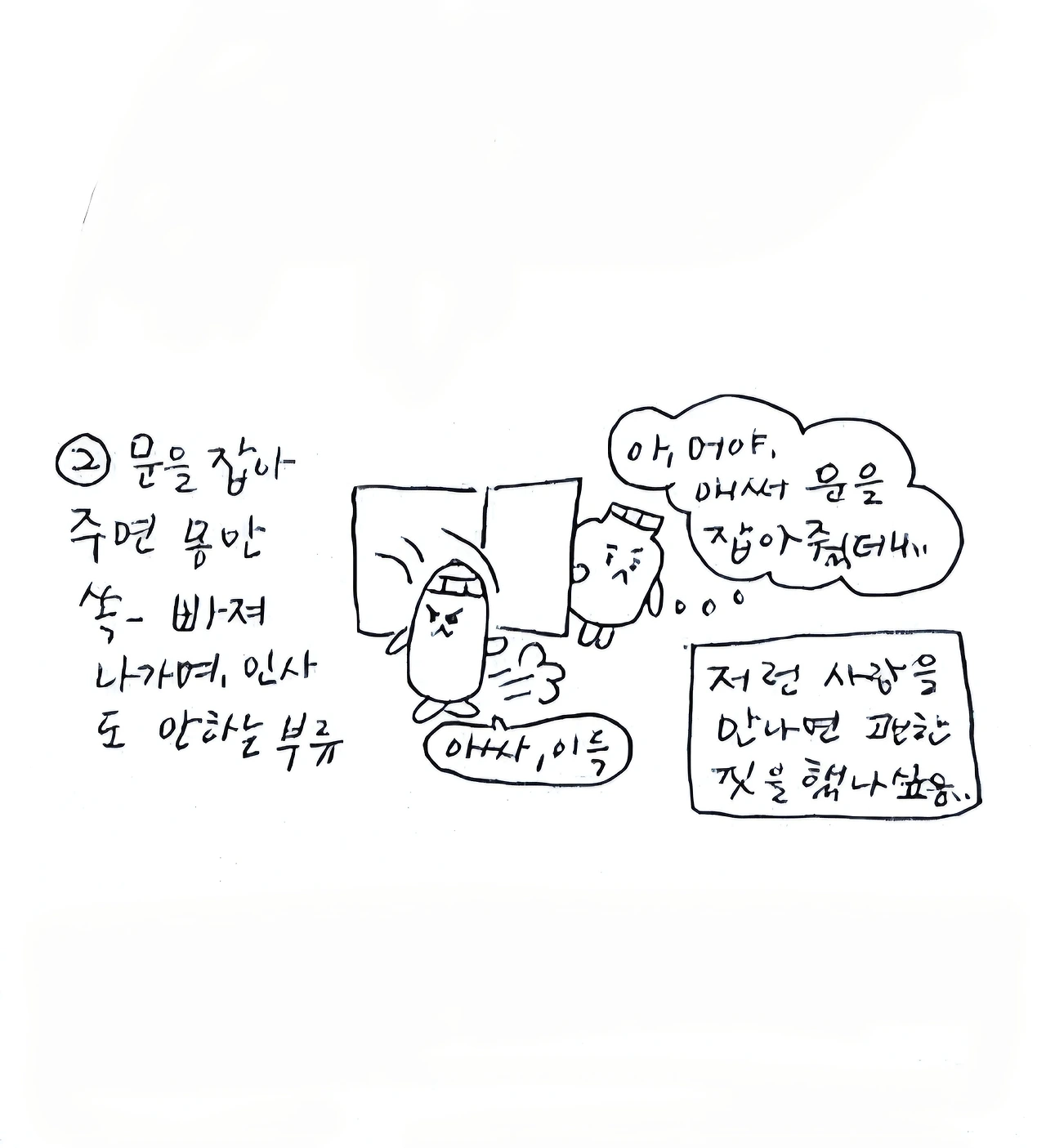 거 참, 문 잡아주면 뒤에서 잡아줘요. 몸만 쏙 빠지지말고/