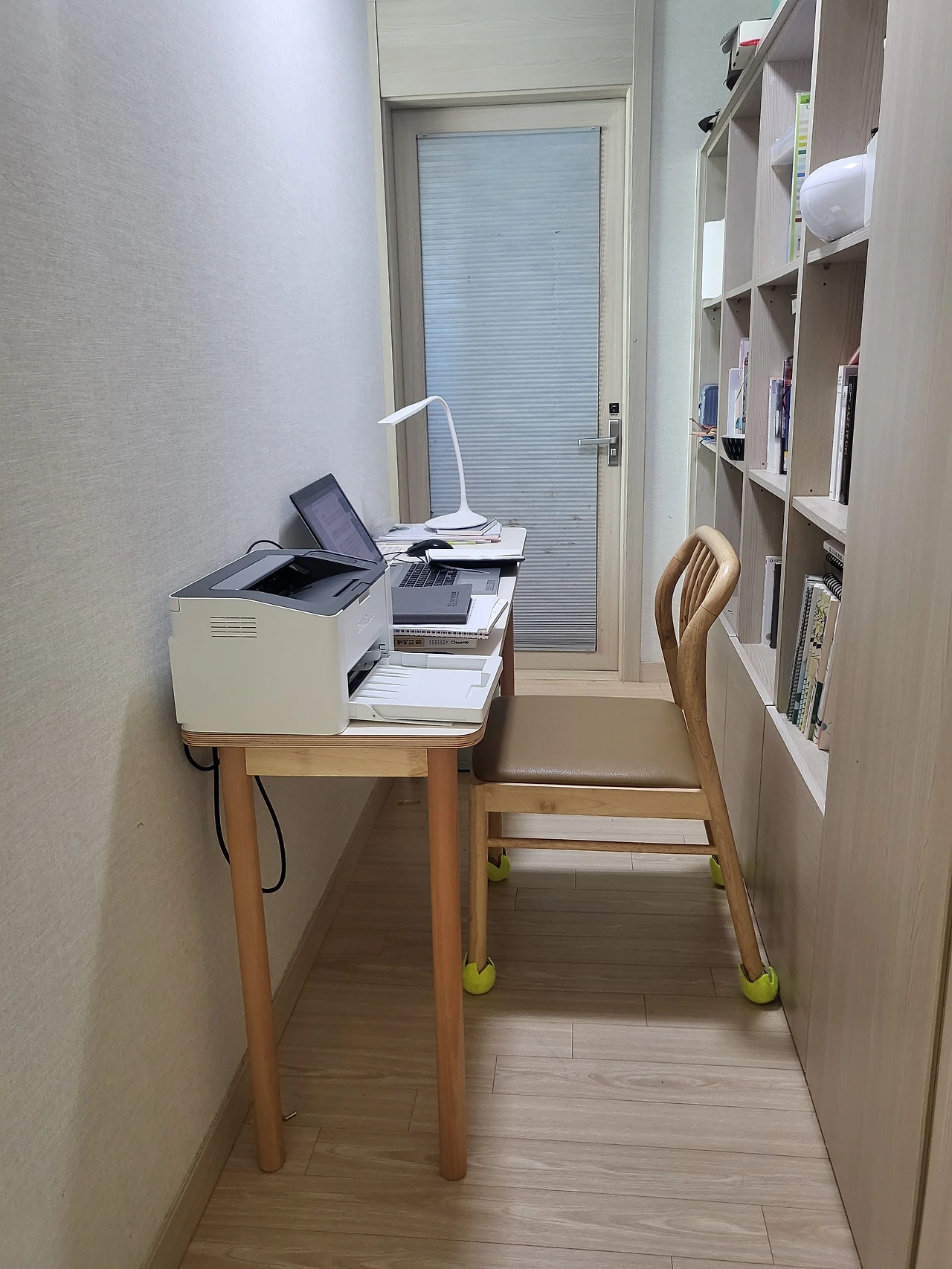 그동안 열심히 돈을 모아 마련한 내 집임에도 불구하고 나만의 공간이 어디에도 없다는 게 서글펐다. 그럼에도 포기하지 않고 집을 곰곰이 살피던 마침내 서재로 삼기에 알맞은 곳을 찾아냈다. 바로 팬트리 앞 공간이였다. 우리 집 구조는 꽤나 독특해 부엌의 경계가 되는 기다란 기둥이 화장실과 세탁실 사이에 있다. 그 기둥은 한 사람이 지나다닐 만한 좁은 통로를 사이에 두고 팬트리와 마주하고 있었다. 그동안 그 팬트리에 채워두었던 아이들 전집 대신 나의 책을 넣어두고 그 앞 통로에 책상을 넣으면 그럭저럭 쓸 만 한 나의 공간이 될 것 같다는 느낌이 왔다.