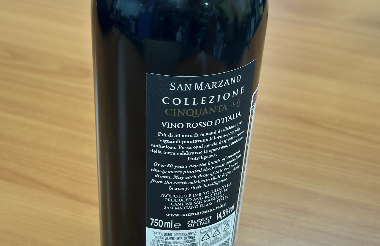 뒷면 라벨에 CINQUANTA 옆에 +6 같은 숫자가 적혀있는데, 이 와인이 2012년이 첫 빈티지였으므로, 2012년에 이 숫자를 더하면 와인의 빈티지가 된다. 즉 내가 구매한 와인은 '2022+6'으로 2018 빈티지가 된다.