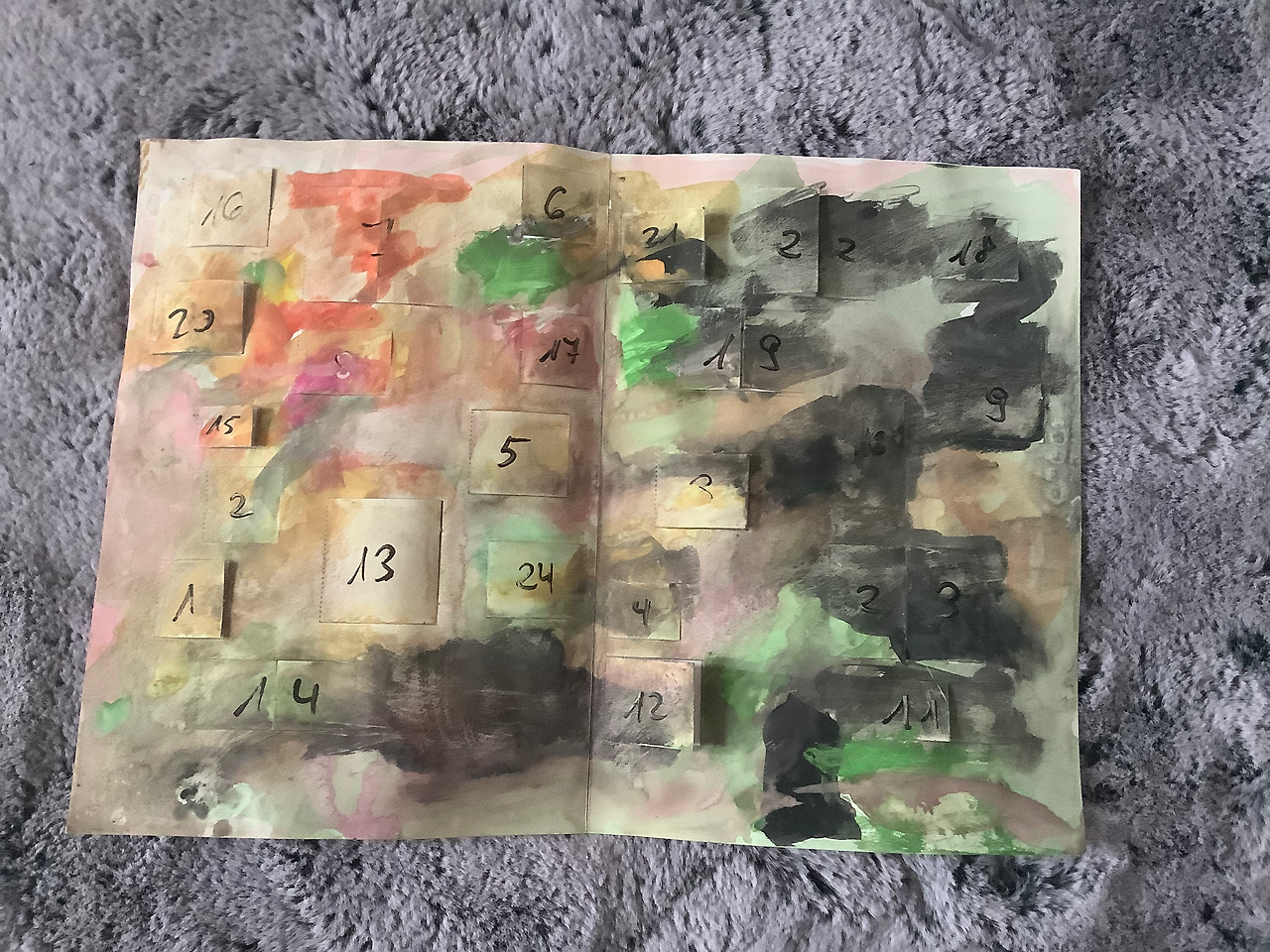 아래는 빈이가 학교에서 만들어 선물해준 어드벤츠 칼렌더인데 본인과 친구들이 돌아가며 직접 그림을 그려서 채운 종이 위에 저렇게 창문을 낸 종이를 덧 대어 날짜를 쓰고 다시 색칠을 해서 완성했다고 한다.