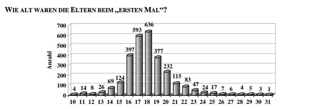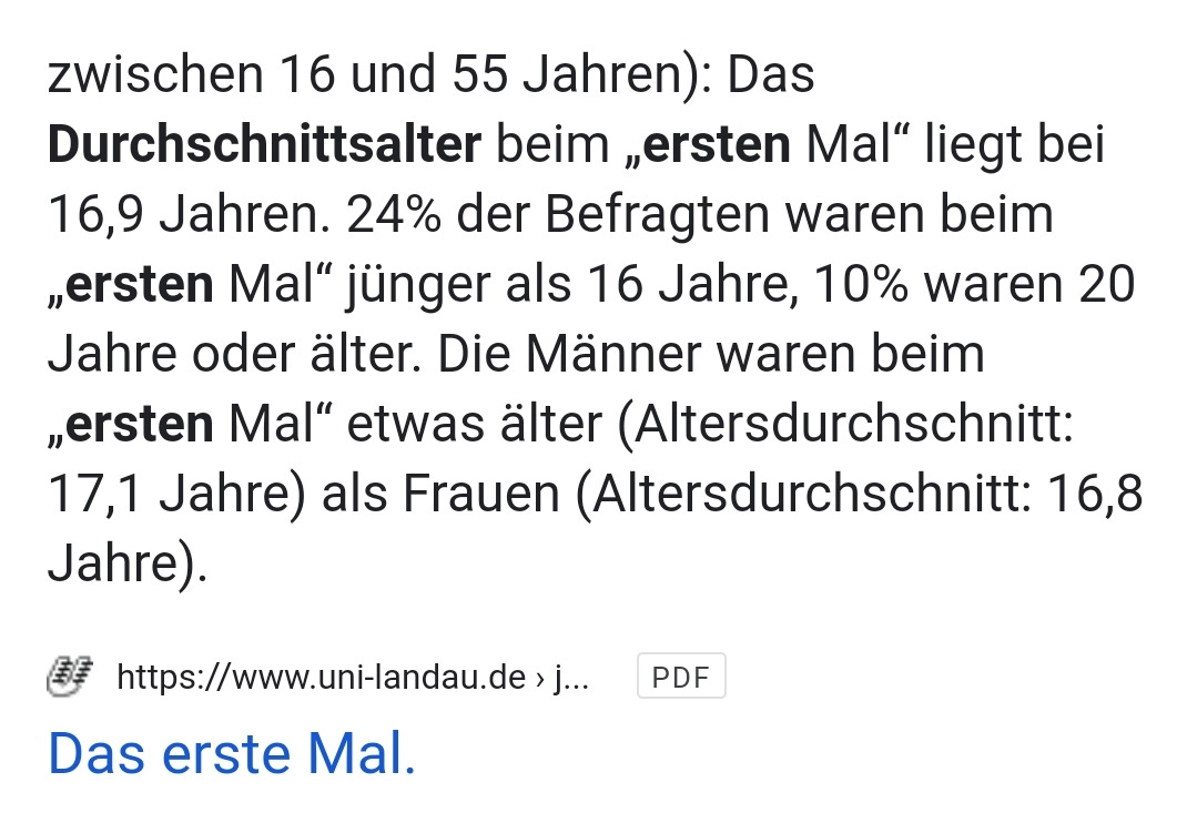 이것은 구글 검색에서 첫 경험 나이를 독일어로 검색했을 때 가장 먼저 뜨는 결과이다. 만 16-55세 사이의 사람들에게 첫 경험의 나이를 물어본 결과 만 16.9세라고 대답했다. 한국으로 치면 고1 겨울방학쯤 되겠다.