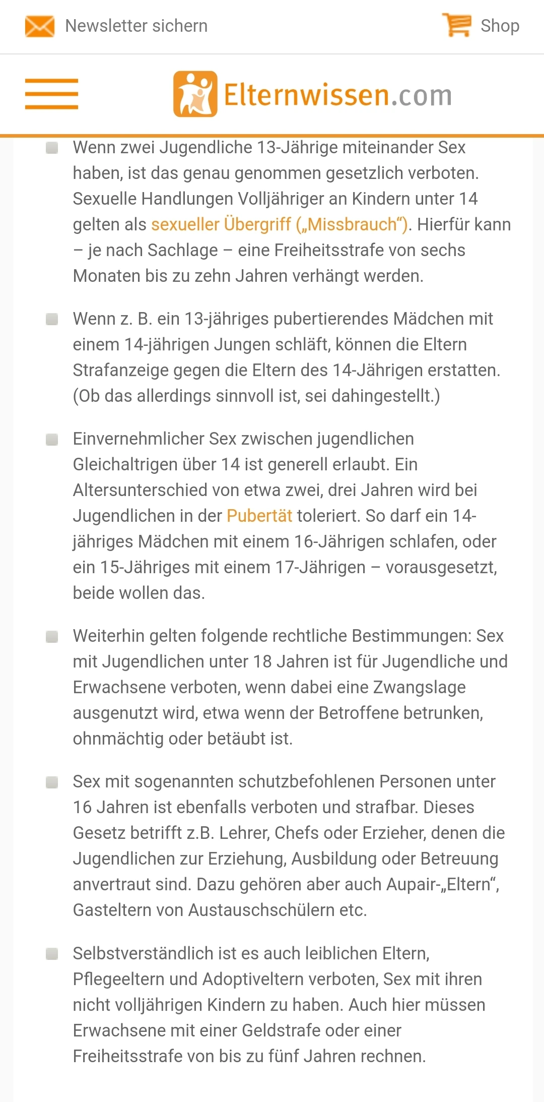 1. 만약 만 13세의 두 청소년이 섹스를 한다면, 법적으로 금지된 것으로 여긴다. 만 14세 미만의 아동에 대한 성인의 성적인 행위는 성적 침해, 다시 말해 성폭행으로 간주한다. 이것에 대해 - 상황에 따라 다르지만 - 6개월에서 10년 사이의 금고형에 처해질 수 있다.