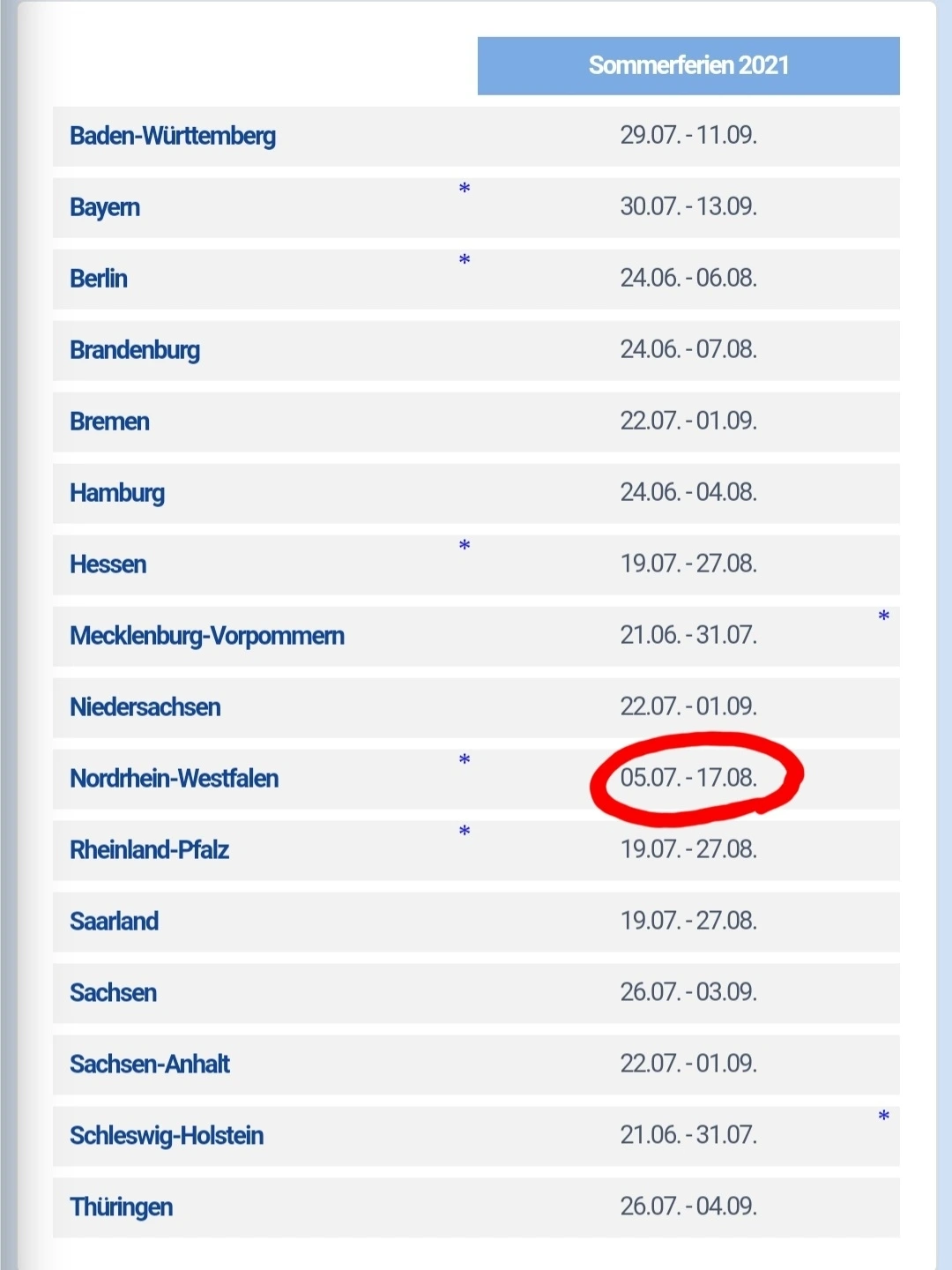 독일 학교의 여름방학은 6주다. 개학은 신기하게도 수요일이며, 신입생 입학식은 대부분 개학 다음날인 목요일에 치러진다. 방학 시기는 매년 주 별로 바뀌지만 대략 6월 말에서 9월 초 사이에 이루어진다. 아래 표는 2021년 독일의 주 별 여름방학 플랜이며, 우리가 사는 노트라인 베스트팔렌 주는 17일에 방학이 끝났다.