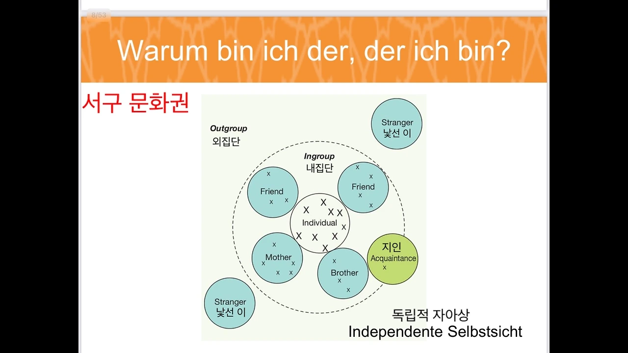 지금부터 보실 영상들에서는 시청자의 이해도를 높이고, 효율적 진행을 위해 상호 의존적 자아상과 독립적 자아상이라는 표현 대신 서양과 동양으로 대체하겠습니다. 영상에서 사용되는 자료의 출처는 설명란에 표시해 뒀고, 원 저작자인 Sebastian Bamberg 교수님께도 허락을 받아 사용하는 것임을 명시합니다.