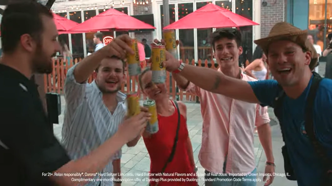 이 길거리의 중심에서 코로나 맥주와 듀오링고는 크로스오버(Crossover) 마케팅의 일환으로 새로운 맥주 자판기를 선보였다. 코로나의 신제품 출시에 맞춰 기획된 이 팝업(pop-up) 이벤트는 음성인식 키오스크에 대고 맥주를 요청하는 사람에게는 공짜로 하드 셀처를 제공한다.