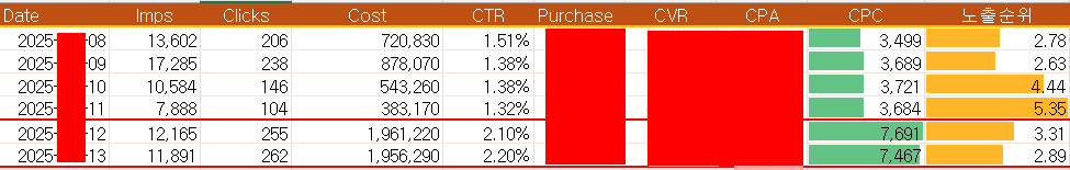 아래는 '가전 카테고리'에서 특정 키워드 X가 N월 8일부터 13일까지 광고비를 소진한 내역을 정리한 스크린샷이다.