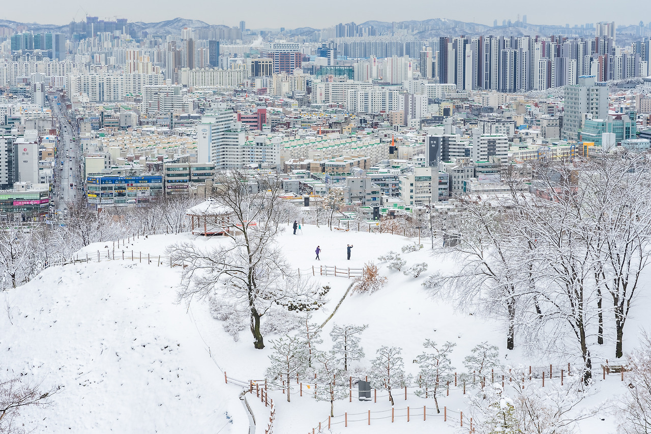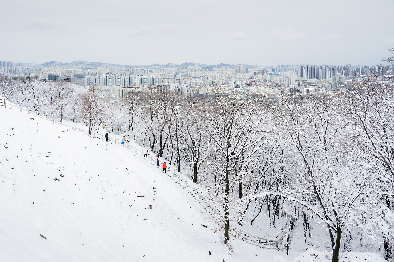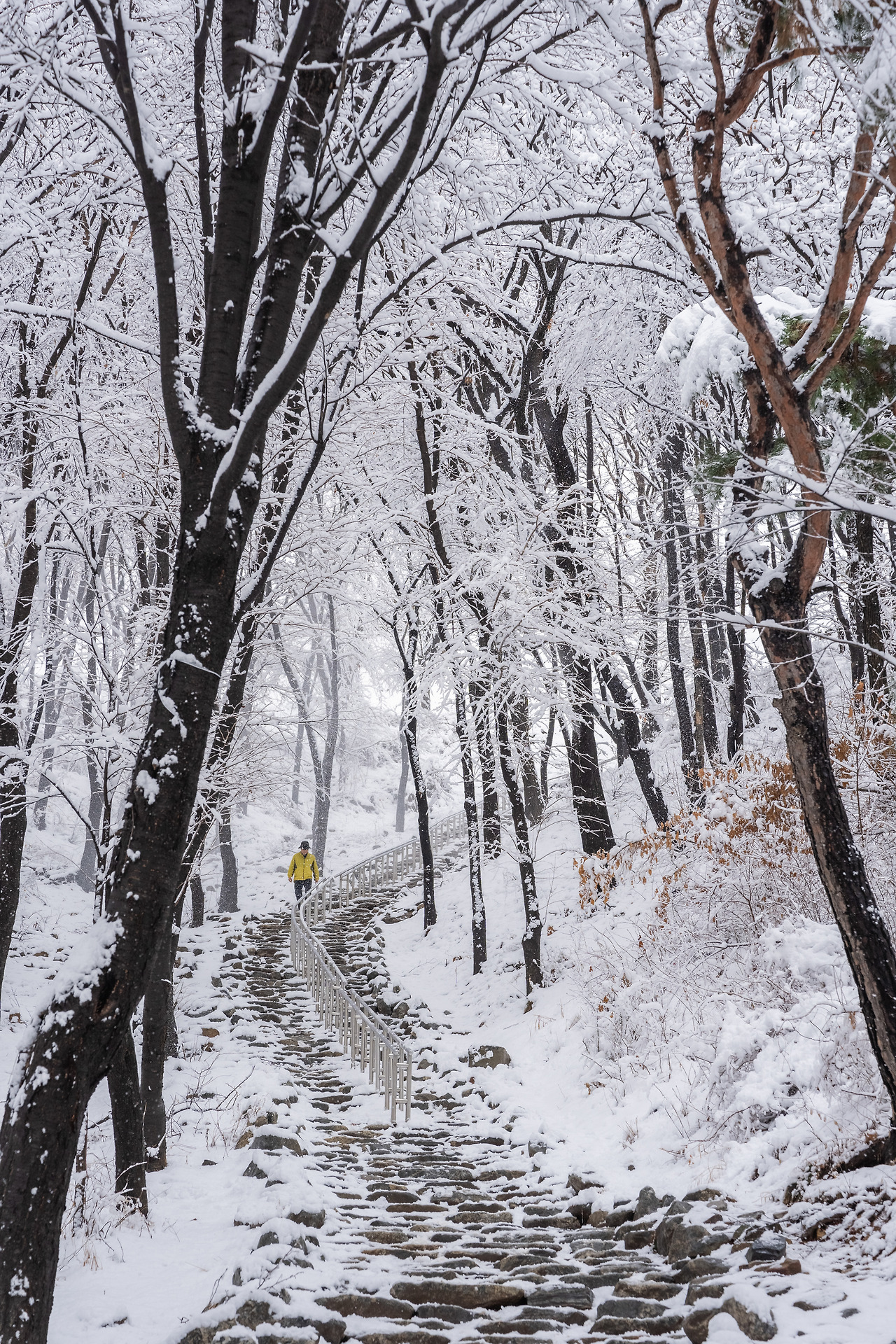 이날도 눈이 많이 올 거라는 일기예보를 전날 들었다. 아침에 일어나 커튼을 여니 온 세상이 하얗게 겨울왕국처럼 바뀌어 있었다. 두근거리는 마음으로 작년에 눈이 애매하게 내려 아쉬웠던 촬영지 중에 하나를 골랐다. 인천 계양산에 있는 계양산성 탐방로다. 눈이 오면 이곳을 꼭 찾는다.