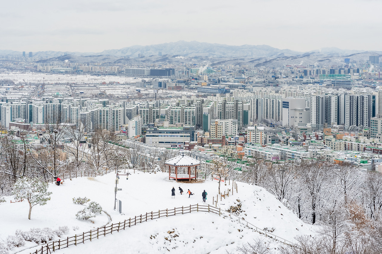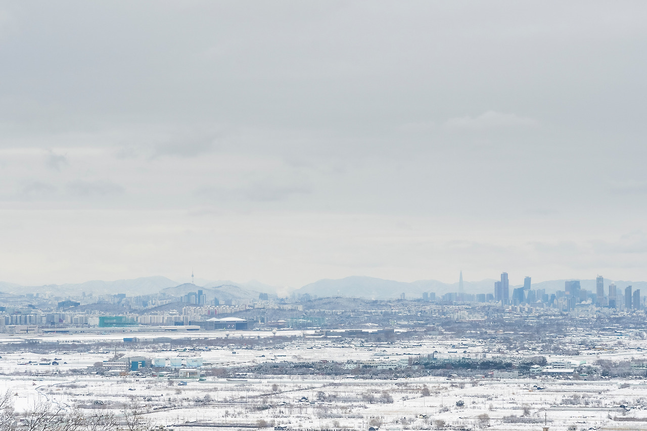등산로 초입은 이미 부지런한 등산객들이 길을 닦아 둔 탓에 돌계단이 드러나 있었다. 나뭇가지에 엉겨 붙은 눈뭉치들은 무게를 못 견디고 후드득 떨어지고 있었다. 미끄러지기 라도 하면 경제활동에 제약을 받을 수 있으니 최대한 조심해서 올라갔다.(내려올 때는 더 조심해야 한다) 숨을 헐떡이다 어느새 우거진 나무숲이 아래로 내려다 보일 만큼 올라갔다. 헉헉 거리며 하늘과 땅만 번갈아 보다가 마지막 계단을 밟는다. 머리를 빼꼼 내미는 듯 계단을 밟고 올라서니, 넓게 펼쳐진 설원이 눈앞을 환하게 밝힌다. 잠시 숨을 고르며 주변을 둘러보다가 계양산성 탐방로 팻말을 확인하고 발걸음을 옮긴다.