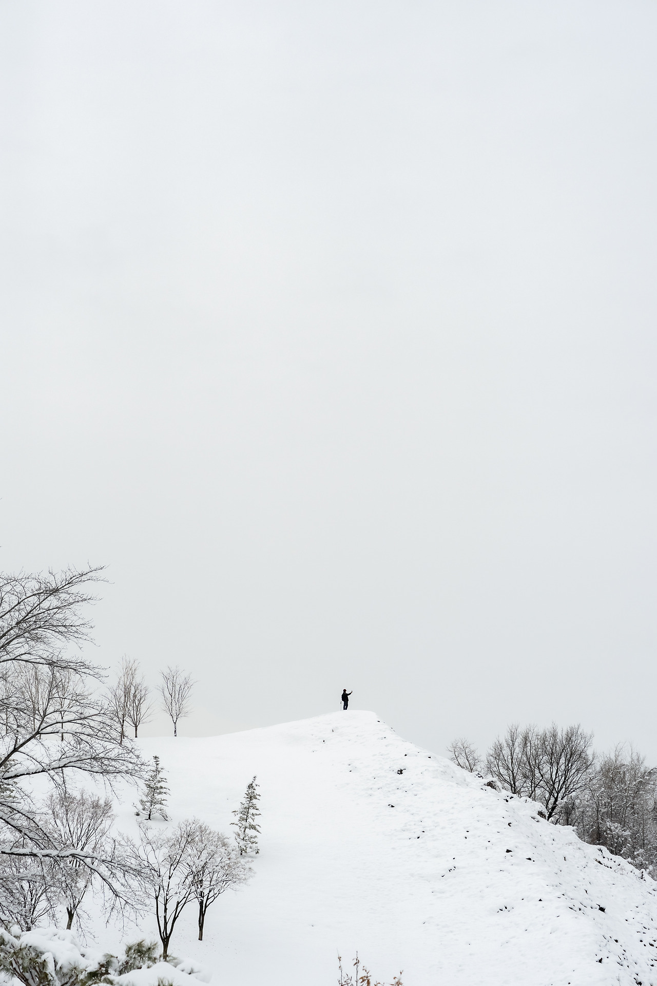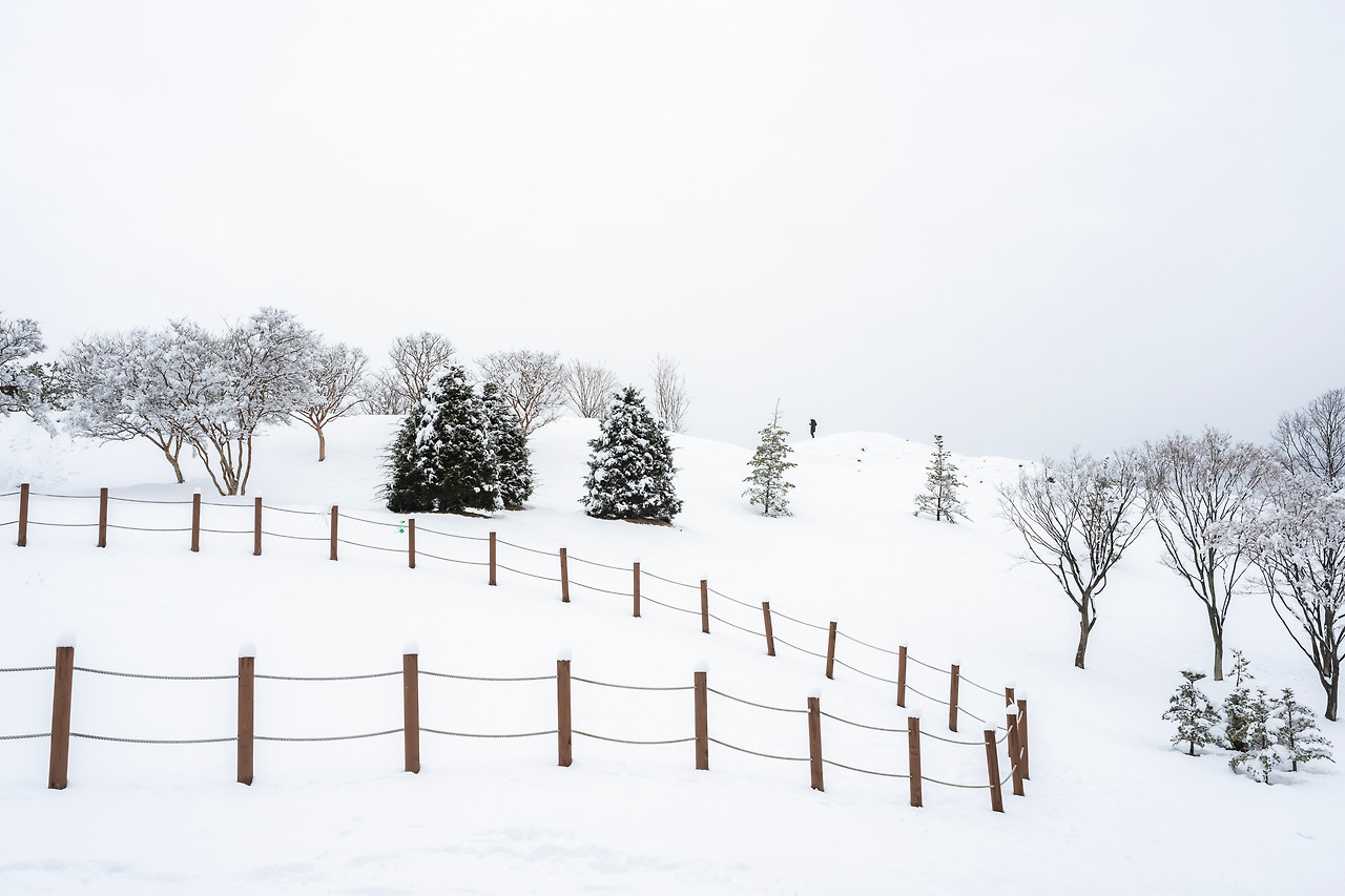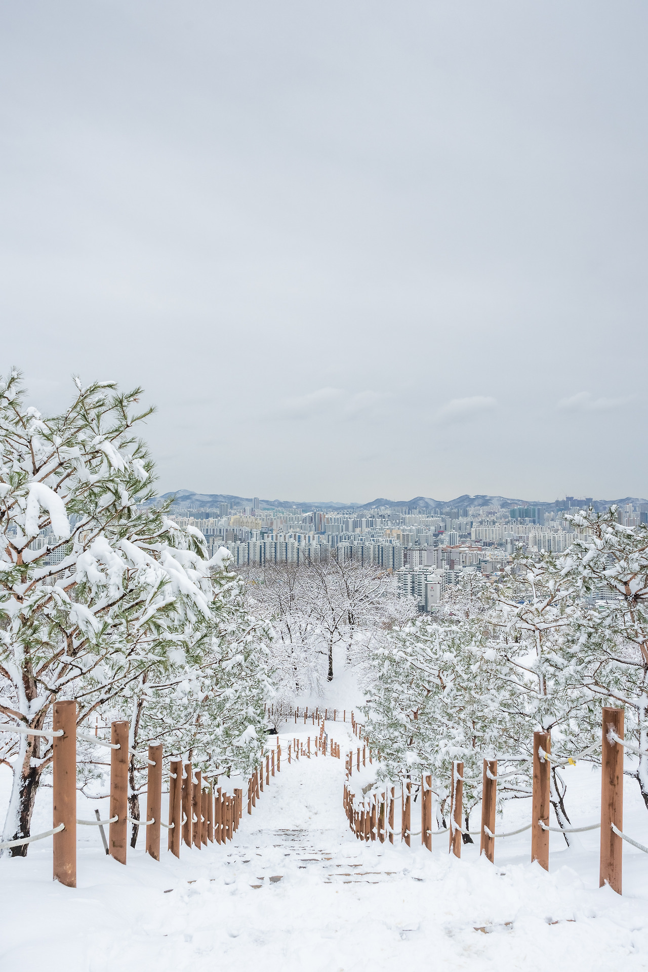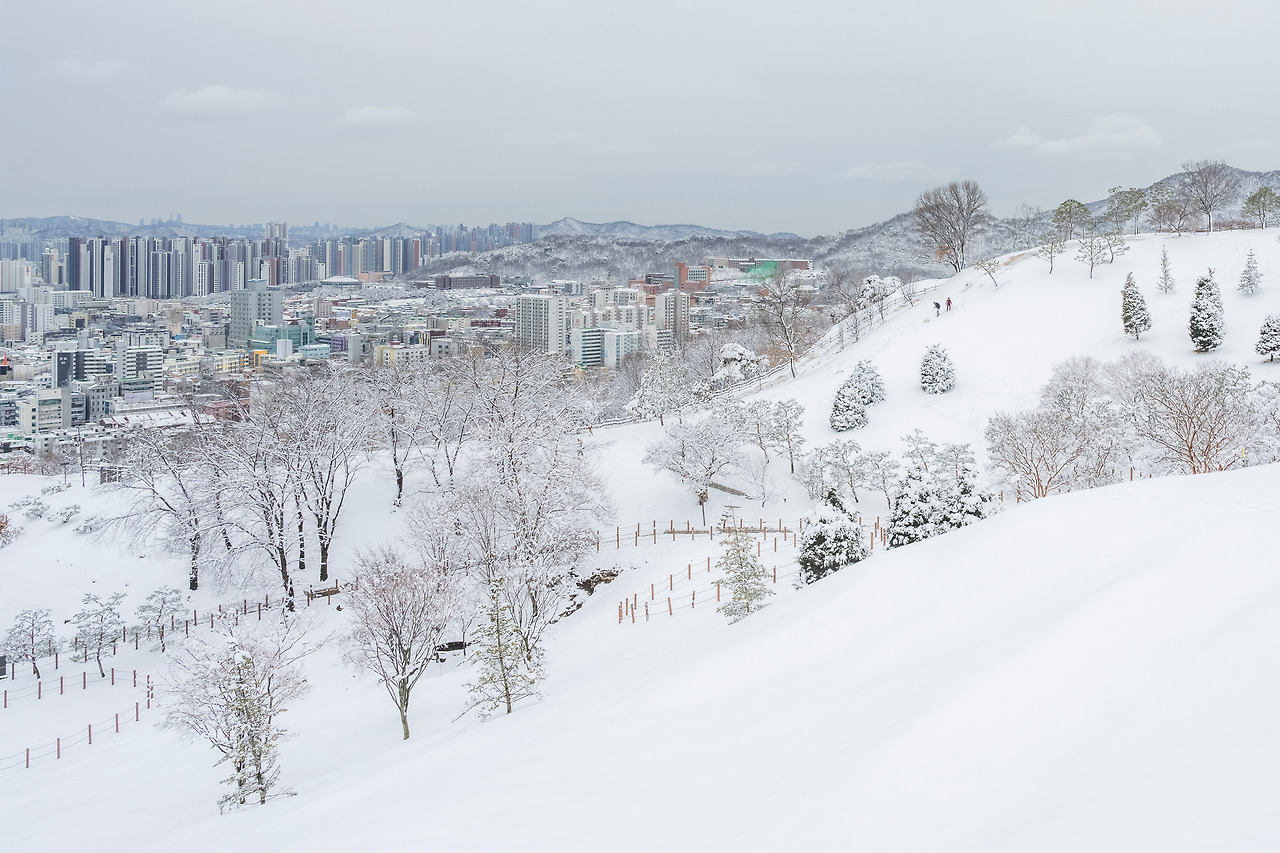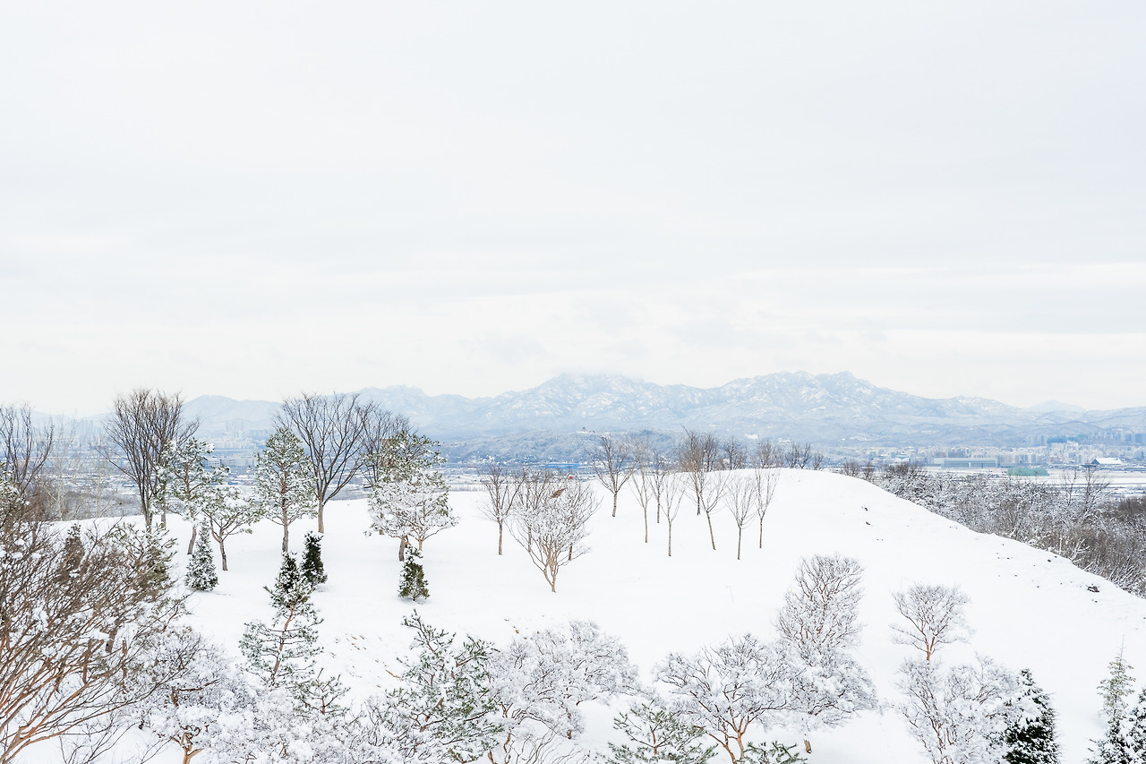 마치 흰색 천으로 덮은 듯, 눈이 지표면 위로 매끈하게 쌓여 있었다. 언덕 굴곡의 입체감이 느껴지지 않을 정도였다. 산책로는 이미 수많은 등산객들에 의해 눈이 녹아 사라지고 진흙으로 변해 있었지만, 아직 밟히지 않은 길에서는 첫 발자국을 남길 수 있는 기회를 가질 수 있었다. 눈밭은 밟을 때마다 뽀드득 소리가 들리고, 발목을 넘길 정도로 깊이 파였다. 주변이 온통 하얀 곳까지 가니 입체감이 없는 탓에 원근감을 상실당할 정도였다. 오랜만의 설경이었다. 다른 장소도 가보고 싶었지만 몸이 하나라서 아쉬울 따름이었다.