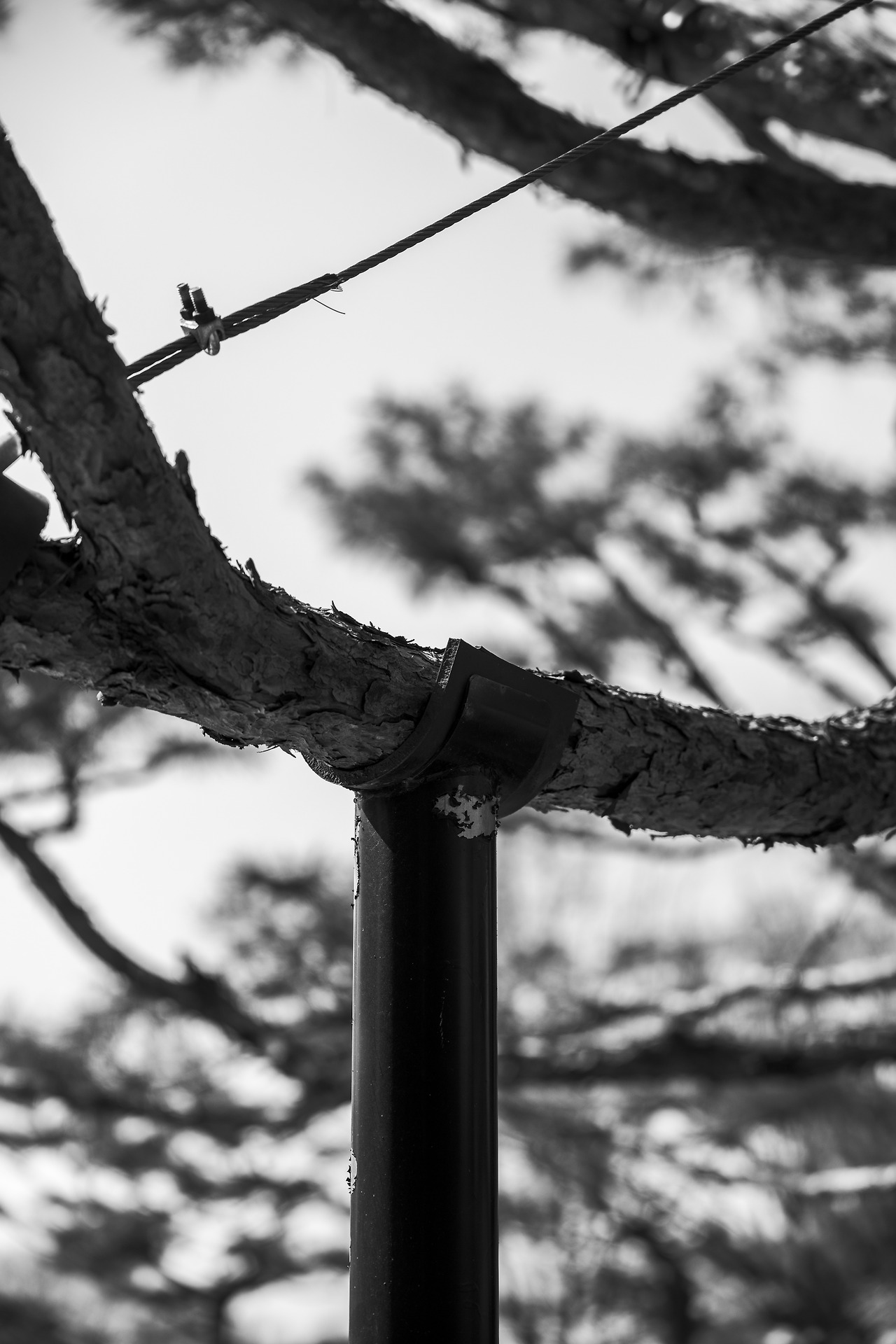나무가 쓰러지거나 부러지지 않게 받치고 있는 저 버팀목을 ‘지주’라고 합니다. 보통은 어린 나무가 올바른 방향으로 자랄 수 있게 도와주거나, 오래된 나무가 부러지지 않도록 받쳐주는 역할을 합니다. 공원 등지에서 자주 볼 수 있는 풍경이었지만, 이 날은 유독 눈에 띄었습니다. 가까이 가서 살펴보니 나무 가지가 부러지지 않게 받치고 있는 모습이 꽤나 안정적입니다. 인체공학을 넘어서 ‘목체공학적’으로 만들어져 나무가 팔을 걸치고 있는 모습이 매우 편안해 보입니다.