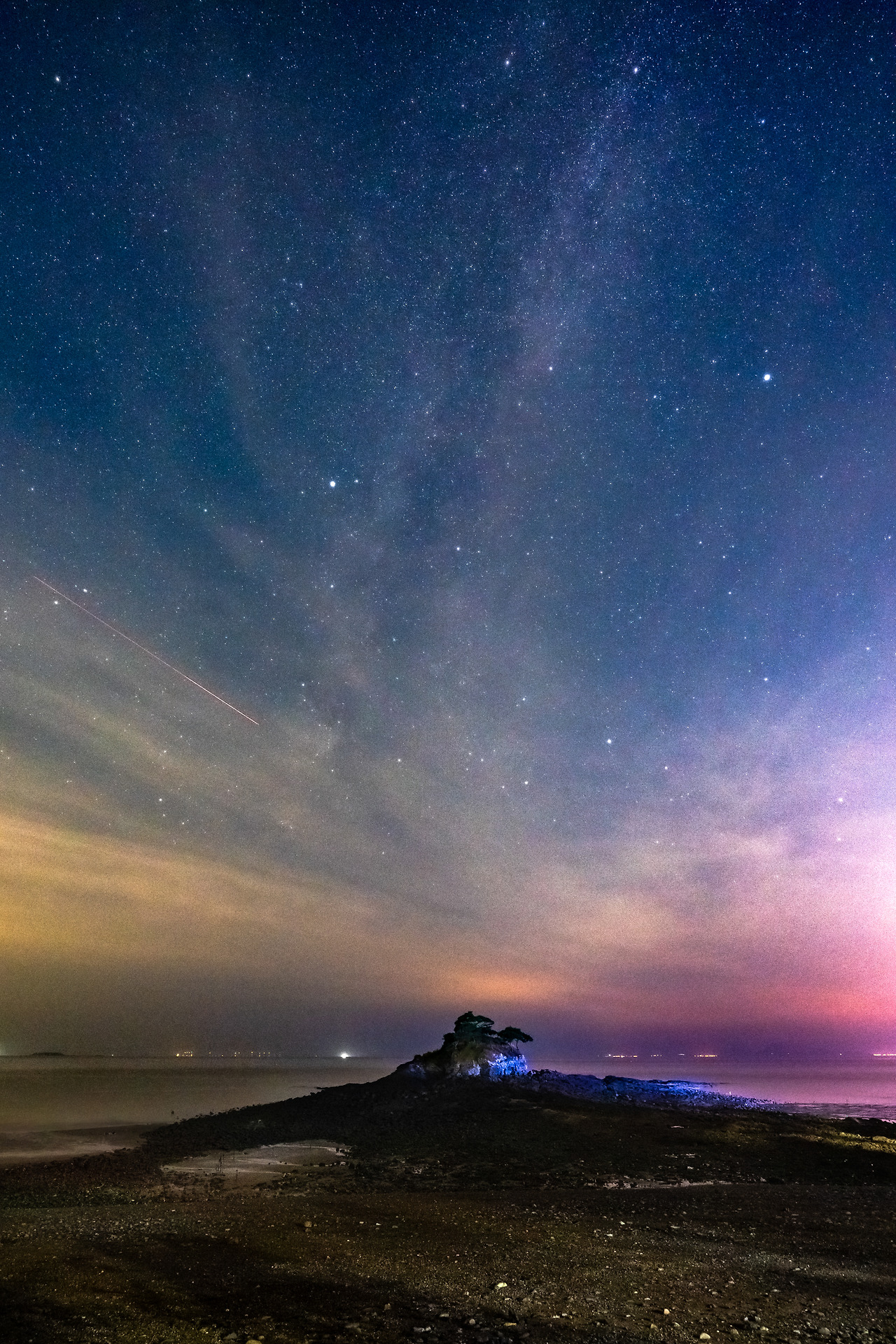 의도치 않게 구름과 은하수가 잘 어울렸다. 각기 다른 인공광들이 먹구름에 다양하게 색을 입히고, 거기서 은하수가 갈라져 나온 것 같았다. 간조 때문에 드러난 거친 바닥은 별과 조화를 이뤘다. 방해가 될 거라 생각했던 등대 불빛은 솔섬 옆에 포인트를 준 듯했다. 별처럼 빛나는 바다 위 고기잡이 배들은 구름 낀 수평선을 심심하지 않게 만들었다.
