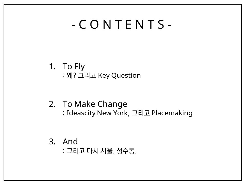 요약하면, 새로운 것을 보는 것에 목말랐고, 뉴욕의 IdeasCity가 아주 적합한 물이라는 추천을 철썩같이 믿어보기로 한 것이다. 그리고 이 믿음이 결코 틀리지 않았음을 만 천하에(?) 전파하고 책임감에 날개를 달기 위해 이 출장 후기를 쓰기로 하였다. 보고, 듣고, 느낀 그 모든 것들을 다 나열하여 상술하고 평가하고 싶지만 선택과 집중 그리고 우선순위를 잘 정하는 것이 바로 프로의 모습 아니겠는가. 10일간의 경험을 잘 분해하고 재조립하여, 다음과 같은 내용으로 3회에 걸쳐 이 출장 리뷰를 써내려가려 한다.