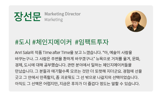 그 일은 누가 하나? 물론 기계가 할 수도 있겠지요. 미션을 가진 투자자와 투자처 모두에게 유용한 데이터베이스는 필수입니다. 하지만 저는 그런 기계 말고 몇몇 회사 동료들 그리고 성수동 동료들의 얼굴을 떠올립니다. 그들은 누구보다 따뜻한 마음을 가졌고, 냉철한 분석력으로 데이터를 관리하며, 또 성실한 실행력을 가진 친구들입니다. 이 직업은 감수성과 분석력, 아트와 사이언스를 동시에 가져야 가능합니다. 기자, 소설가나 에세이스트도 노려볼 만 하고, 건축가도 자격이 있어 보입니다. 마케터나 financier도 포함입니다. what이 분명한 직업이니까요. 전 이 직업이 꽤 유망한 것 같습니다. 깊이와 너비를 논할 정도로, 원조를 논할 정도로 임팩트 투자는 지평을 넓혀 가고 있으니까요. 측정도 중요합니다. 하지만 전 컨텐츠를, 손에 잡히는 분명한 무언가를 만들 줄 아는 사람이 지원하길 바랍니다. 자가 있어도 대상이 없다면 무엇을 측정하겠습니까? 그래서 측정이라기보다는 교통정리 내지 Taxonomy 분류를 해 내는 능력이 필요합니다. 마지막으로 성장을 고민하는 사람들의 직업이어야 한다는 생각입니다. 변화가 있어야 재는 보람이 있겠지요. 이 모든 생태계의 활동에 대해서는 3편에서 좀 더 정리해 볼 생각입니다.