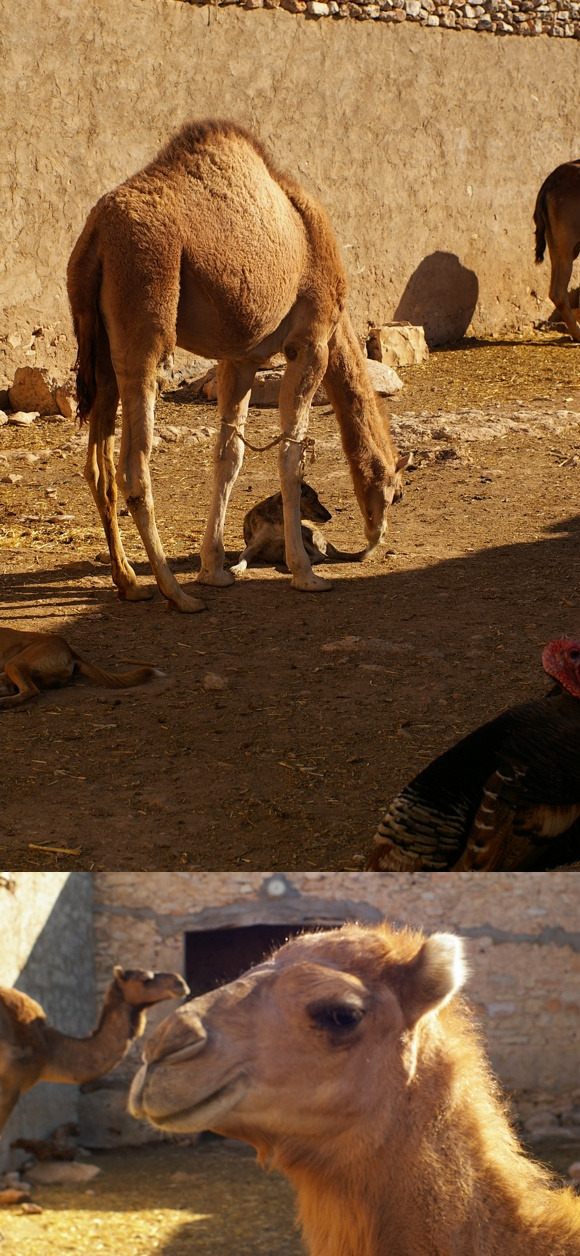 가족들 한 명 한 명과 인사를 하고 마당을 둘러보니 Yassine의 아버지, 어머니, 네 명의 남동생 그리고 Yassine과 꼭 닮은 서너 살 정도 되어 보이는 여동생 둘. Yassine의 가족만으로도 이미 대가족이 살고 있는이 집안에는 그들 말고도 4~5마리 정도의 당나귀, 서너 마리의 뮬, 다 큰 소와 두 마리의 송아지, 염소가 두 마리, 사방팔방 뛰어다니는 개가 넉넉잡아 대여섯 마리. 칠면조 서너 마리와 그 뒤를 따르는 새끼 칠면조들. 그리고 여기저기서 나타나는 고양이 들와 낙타까지 있었다. 애완용 낙타라니. 모로코 판 노아의 방주라 해도 놀랍지 않은 대가족이었다. Yassine의 가족과 낙타는 오랜만에 온 큰 아들과 그의 친구인 나를 정말 따듯하게 대해주었다.