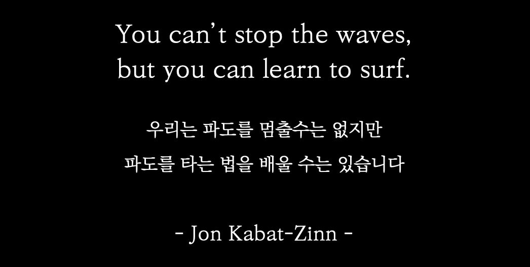 세상 모든 것은 시작과 끝이 있다. 불처럼 일어난 분노의 감정에도 그 끝은 있고, 끝없을 것 같은 사랑 또한 그 끝은 있다. 지금 당장 내 콧잔등을 간지럽히는 간질간질한 이 느낌에도 끝은 있으며, 힘들게 달려와 드디어 만끽하는 어떤 성취의 순간에도 끝은 있다. 그러므로 당신이라는 대양 위에 일어나는 그 파도에도 그 끝은 있다. 쓰나미처럼 몰려가 당신을 덮칠 것 같은 그 파도에도 끝은 있다는 사실을 이해하고 믿어라. 당신이 해야 할 것은 억지로 그 성난 파도를 눌러 없애는 것이 아니라 그것이 결국 대양의 상태로 돌아올 때까지 그저 지켜보고 바라보는 것이다. '아, 지금 일어나는 이 감정은 00이구나' 하고 이름 붙여주며 말이다. 성난 파도도 언젠가 대양의 상태로 돌아가듯, 당신이라는 스크린 위에서 지금 절찬리 상영 중인 그 감정과 생각도 결국은 막을 내리는 순간이 시간이 있으니. 그저 두 눈을 지그시 감고 당신이라는 빈 의식 위에서 일어나고 있는 일이 무엇인지 바라보라. 나 자신이 그 성난 파도인 줄 알고 무엇인지도 모르는 감정에 휩싸여 나를 덮치는 것이 아니며, 나라는 존재가 지금 그 상영관에서 절찬리 상영 중인 그 영화 자체가 아니며, 길 건너의 나 자신도 아닌 그저 한 걸음 물러나 바라보고 있는 평안한 의식이라는 것을 이해하는가? 그렇다면, 그 파도에. 그 영화에 그리고 길 건너의 나 자신에 이름을 붙여보라. 지금 나의 파도는, 영화는, 길 건너의 나는 '어떠한' 상태이구나 하고. 이름 붙여보라. 그것을 지켜보는 것만으로도 당신은 이미 마음이 평안해짐을 알게 될 것이다.