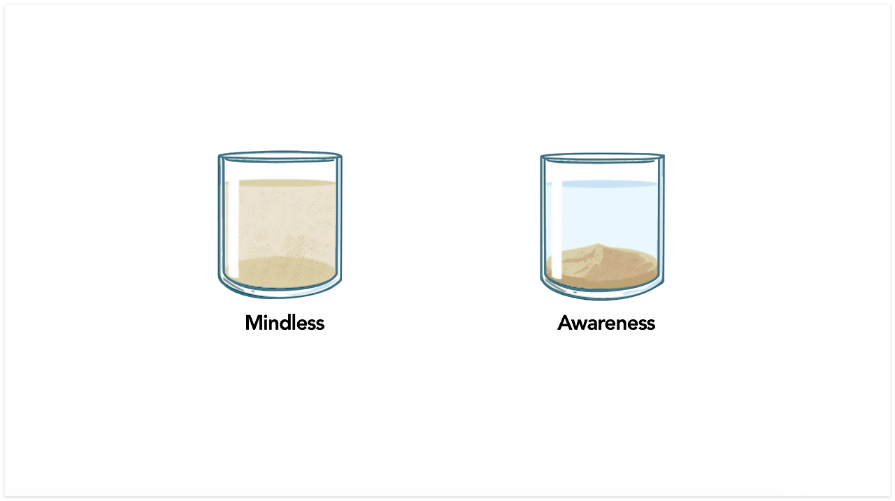즉, 평소의 우리의 의식 상태는 마치 물컵에 여러 잔여물들이 떠도는 것과 같이 생각으로 가득한 상태라면 호흡하며 명상하는 동안은 생각의 불순물들이 잠시 바닥으로 가라앉으며 생각의 안개가 옅어진 상태, 맑은 의식의 상태가 되는 것이다. 그리고 이는 Mind-full (가득 찬 상태)에서 Mindful (의식적인) 상태로 전환되는 과정이라 할 수 있을 것이다. 일상 속에서 가만히 멈추어 호흡하며 지켜볼 때, 우리는 옅어지거나 비워진 의식의 상태를 지켜볼 수 있으며 이때 오직 인간만의 대체불가한 힘이 떠오르는 것을 경험할 수 있는데, 그것이 바로 '직관의 힘'이다.