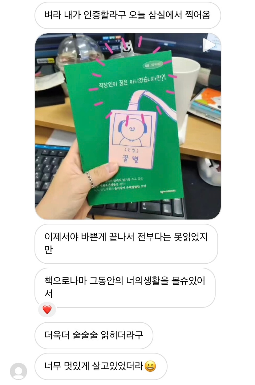 여전히 네이버에 <직장인이 꿈은 아니었습니다만>을 검색하고 최신순으로 구경하곤 한다. 독자님들의 반응을 본다. '제목이 끌려서 구매했다.', '신입사원의 마음을 이해하고 싶어 읽게 됐다.' 등 감사한 시작점들이 있다. 밀리의 서재 댓글도 읽어보는데 '그림이 귀엽다.', '공감하면서 읽었다', '가볍게 읽혔지만 묵직한 메시지들이 인상 깊었다' 등의 후기가 있다.