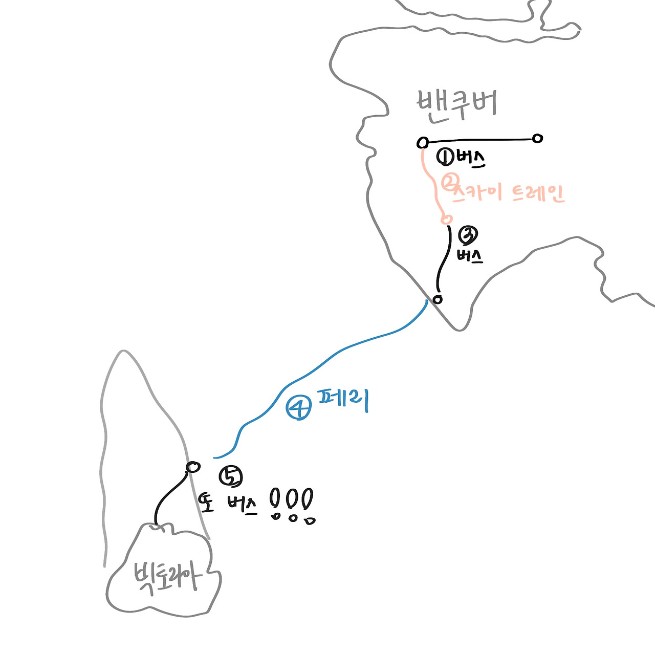 버스와 스카이트레인, 페리까지 갈아탈 일은 많았지만, 페리를 타기 위한 버스를 탈 때부터 편안한 마음을 가질 수 있었다. 나는 이미 성공적인 여행하는 법을 알고 있기 때문이다. 이제부터 앞사람만 잘 따라가면 된다. 동일한 목적지를 가지고 있는 사람들 사이에 껴, 앞만 보고 갈 때의 편안함이란.