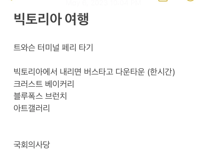 그렇게 밴쿠버에 오기 전부터 가고 싶었던 빅토리아 당일치기 여행 계획을 세우기 시작했다. 극강의 P답게 출발 전 날 밤, 침대에 누워 사람들이 많이 가는 곳들을 정리했다.
