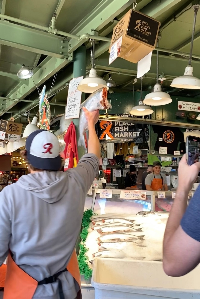 시장을 구경 하며 Pike place fish market이라는 생선 가게를 지나갔다. 그곳엔 이미 많은 사람들이 몰려 있었다. 알고 보니 물고기를 던지는 쇼를 보여준다고 했다. 손님과 거래가 완료된 물고기를 직원이 던져 손님이 직접 잡기도 하고, 직원이 잡아주기도 하는 퍼포먼스였다. 운 좋게도 우리가 지나갔던 때가 쇼를 보여주는 시점이었다.