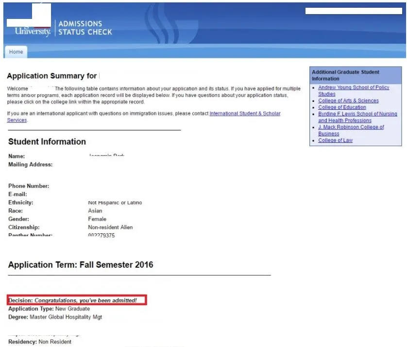 "안녕하세요. 00님. 축하드립니다. 지원대학에 합격하셨습니다!
