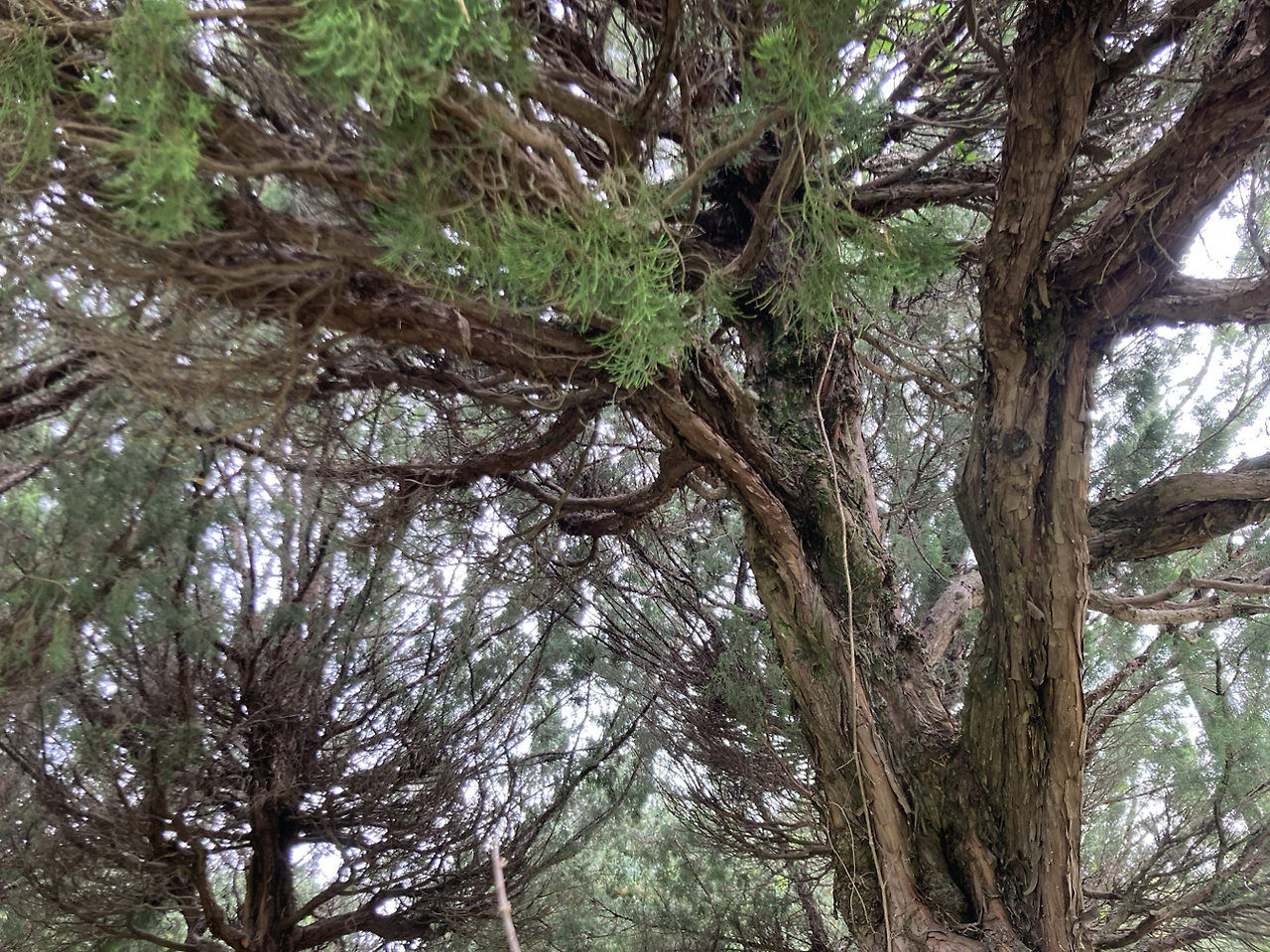 그렇게 오게 된 곳이었다. 천개의 향나무숲. 고백하자면 향나무가 어떤 나무인지 잘 몰랐다. ‘향’나무 라고 하니 소나무나 편백나무에서 나는 나무 심지 냄새가 나는 줄로만 알았다. 침엽수일 것이라 상상했고 꽤 곧게 자랄 것이라는 걸 의심치 않았다. 하지만 가서 본 향나무는 곧기보다는 누군가 슥슥 붓질한 것처럼, 또는 고양이가 그루밍을 하다만 것처럼 곡선의 형태를 띄었다. 바람부는 화면을 그대로 일시정지했을 때 한쪽으로 휘거나 움직이는 모습처럼 자라있었다.