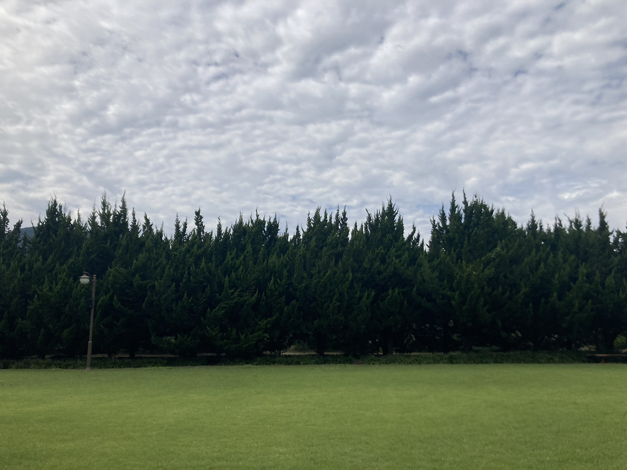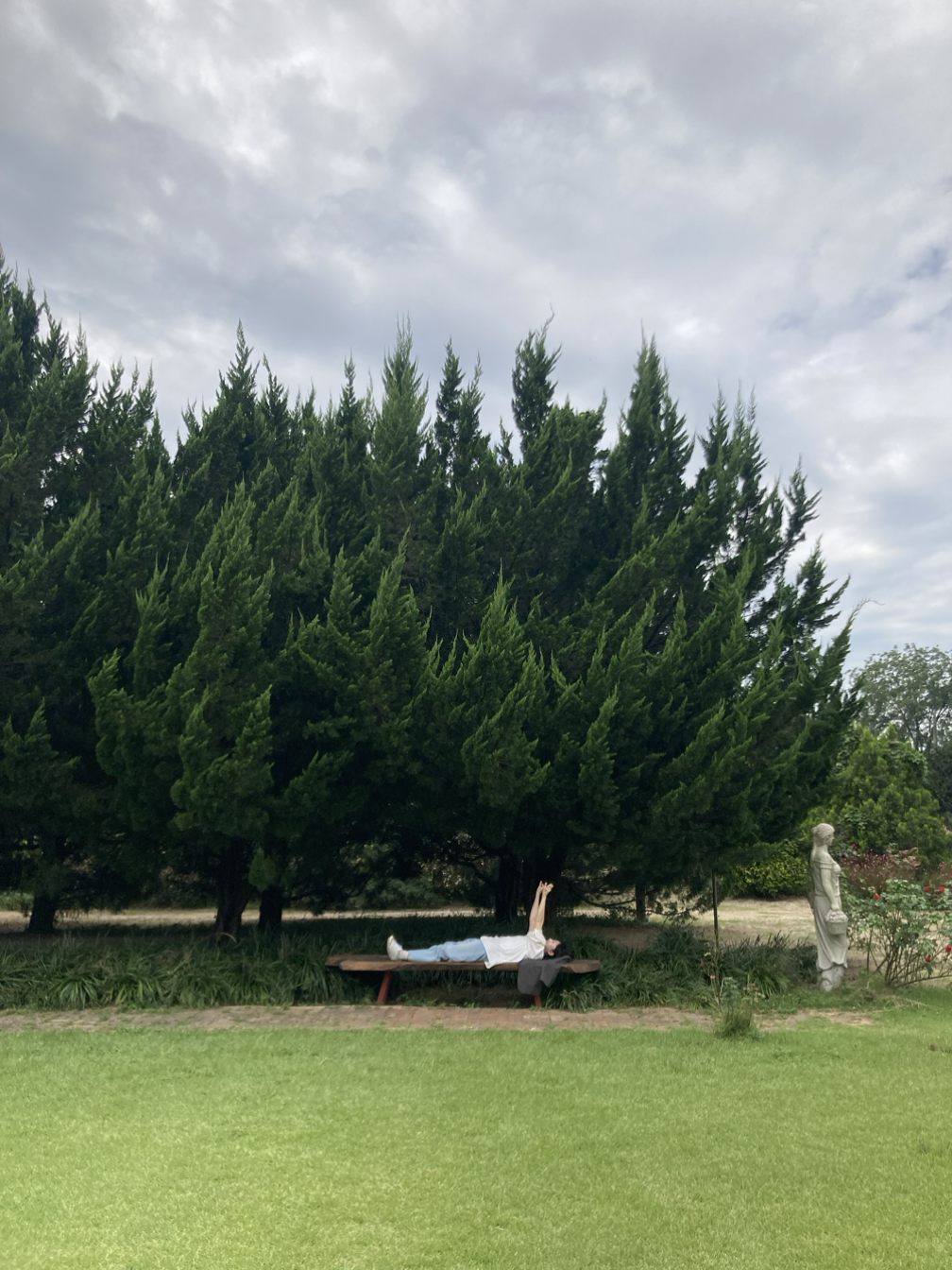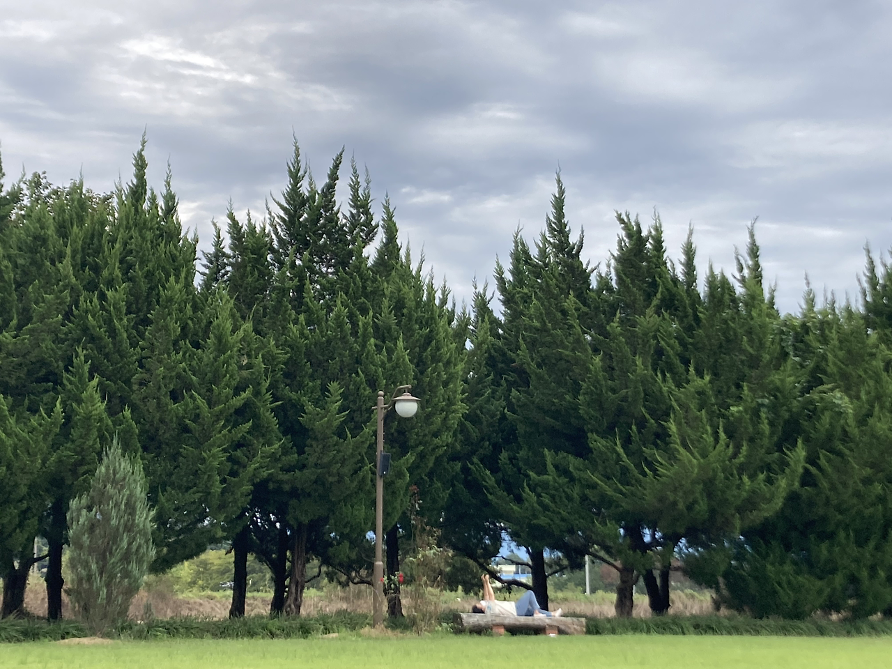 내가 봤던 탁 트인 초록 잔디와 향나무숲은, ‘잔디광장’이라는 데였다. 실망이 앞섰다. 천개의 향나무가, 그 잔디광장에 모두 늘어서 있어서 ‘탁 트인’ 뷰를 머릿속으로 그려왔었다. 하지만 스마트폰에는 수평으로 딱 잘 담길 수 있는, 아담한 정원이었다. 화면으로 봤을 때는 모른다는 건 이런 게 아닐까, 약간 속았다는 느낌으로 잔디광장을 배회했다. 가장자리를 돌다가 조효가 벤치를 발견하곤 앉았다. 그리고 누웠다. 누워서 하늘을 본다. 바람이 분다고 한다. 너도 누워보라고 한다.