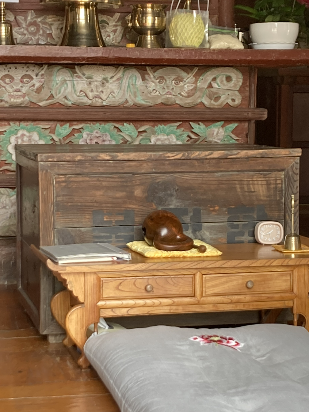 목탁을 두드리고 두드려서 맨질맨질해졌을 빛깔과 나무문 틈 하나까지도 어떤 문양으로 만들지 고민해서 짜 넣었을 손가락, 화려하지 않아도 위엄이 느껴지는 석탑 같은 것들에서 시간을 읽는다. 화려하고 성대한 것들 사이에서 감탄하기도 하지만 우리는 종종 오랜 시간이 흘러도 그 자리에 있는 무언가를 보고서 경탄한다. 오늘의 이 자리에 와서도 나는 조효와 이 산을 처음 발견하고 여기에 절을 만들기로 결심한 사람은 도대체 누굴까. 그 굽이굽이 산을 들어와서 절을 만들기 시작하고 결국 만들어서 지금까지 유지된 그 오랜 세월은 과연 뭘까 하는 이야기를 나눴다.