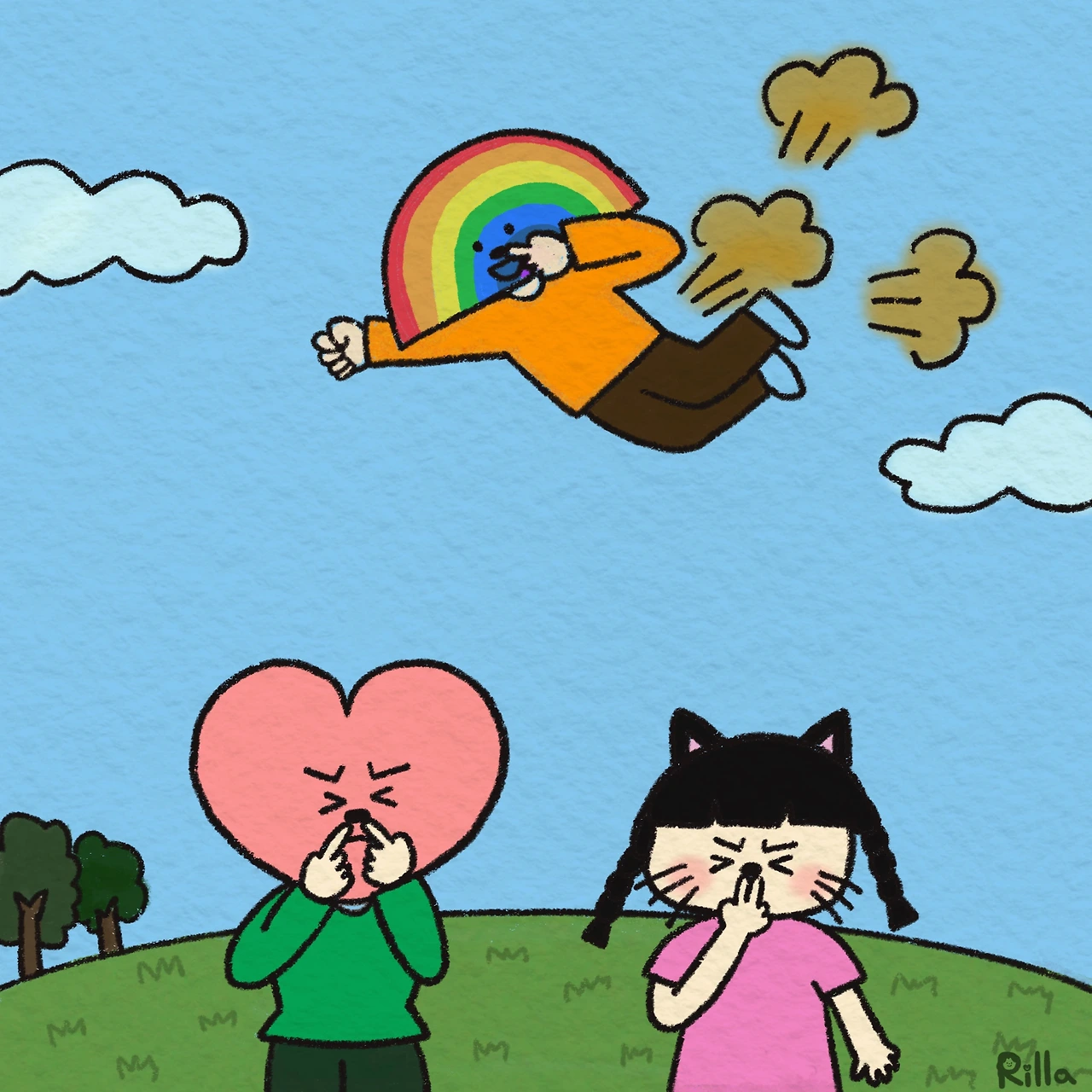 우리 남편 토리씨는 방귀 장난을 유난히 좋아한다. 그래서 방귀가 나올 것 같으면 나와 로라를 놀리는 데 쓰곤 한다. 그럴 때마다 로라와 나는 하지 말라고 이야기하지만 토리씨는 그만둘 생각이 전혀 없다. 물론 우리 집은 방귀자율구역이다. 모두가 원하는 곳에서 나올 때 자유롭게 방귀를 편안하게 배출한다.