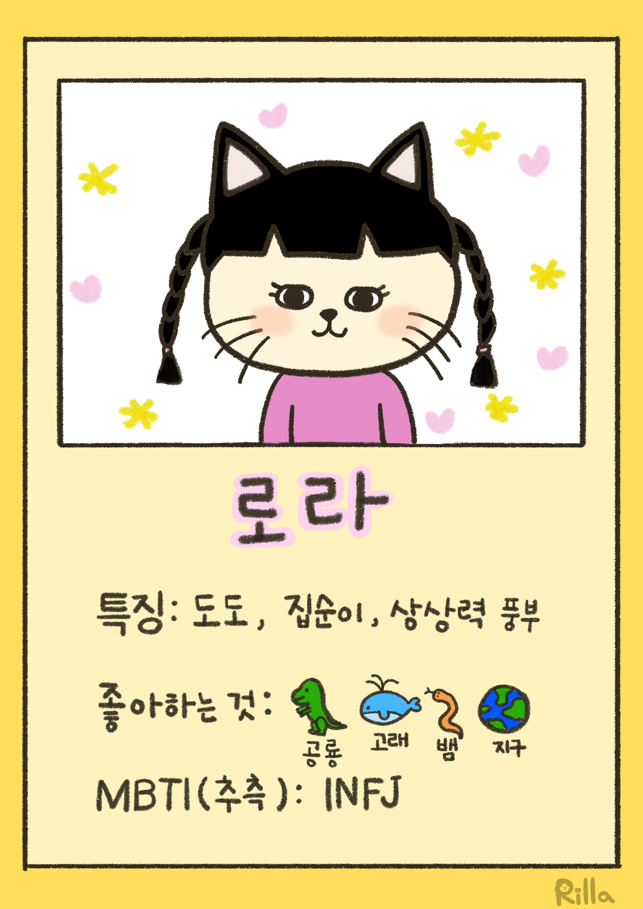 5살 여자아이로 또래여자아이들과는 조금은 다른 취향을 가진 꼬마아가씨랍니다. 공룡과 고래를 좋아하고, 자신만의 무궁무진한 상상의 세계를 갖고 있답니다.