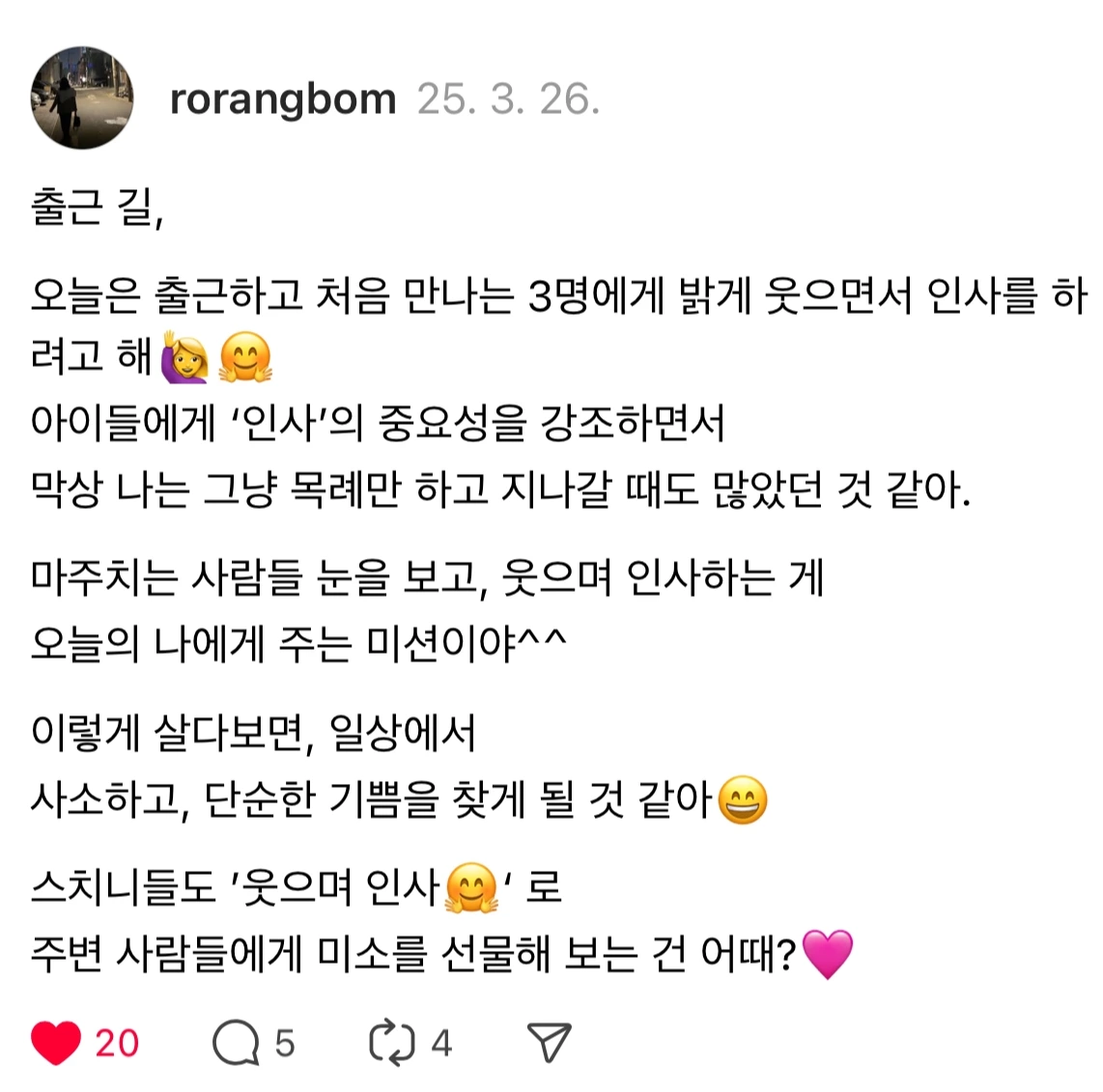 '먼저 웃으며 인사하기' 미션으로