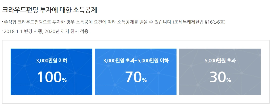 조세특례제한법에 따라 벤처기업에 투자하면 소득공제 혜택을 받을 수 있는데요. 벤처기업, 즉 스타트업에 투자할 수 있는 방법 중 증권형(투자형) 크라우드펀딩이 있습니다. 또한 투자한 금액에 따라 3천만 원까지 100%, 5천만 원까지 70%, 5천만 원 초과분은 30%의 소득공제를 적용받을 수 있습니다.